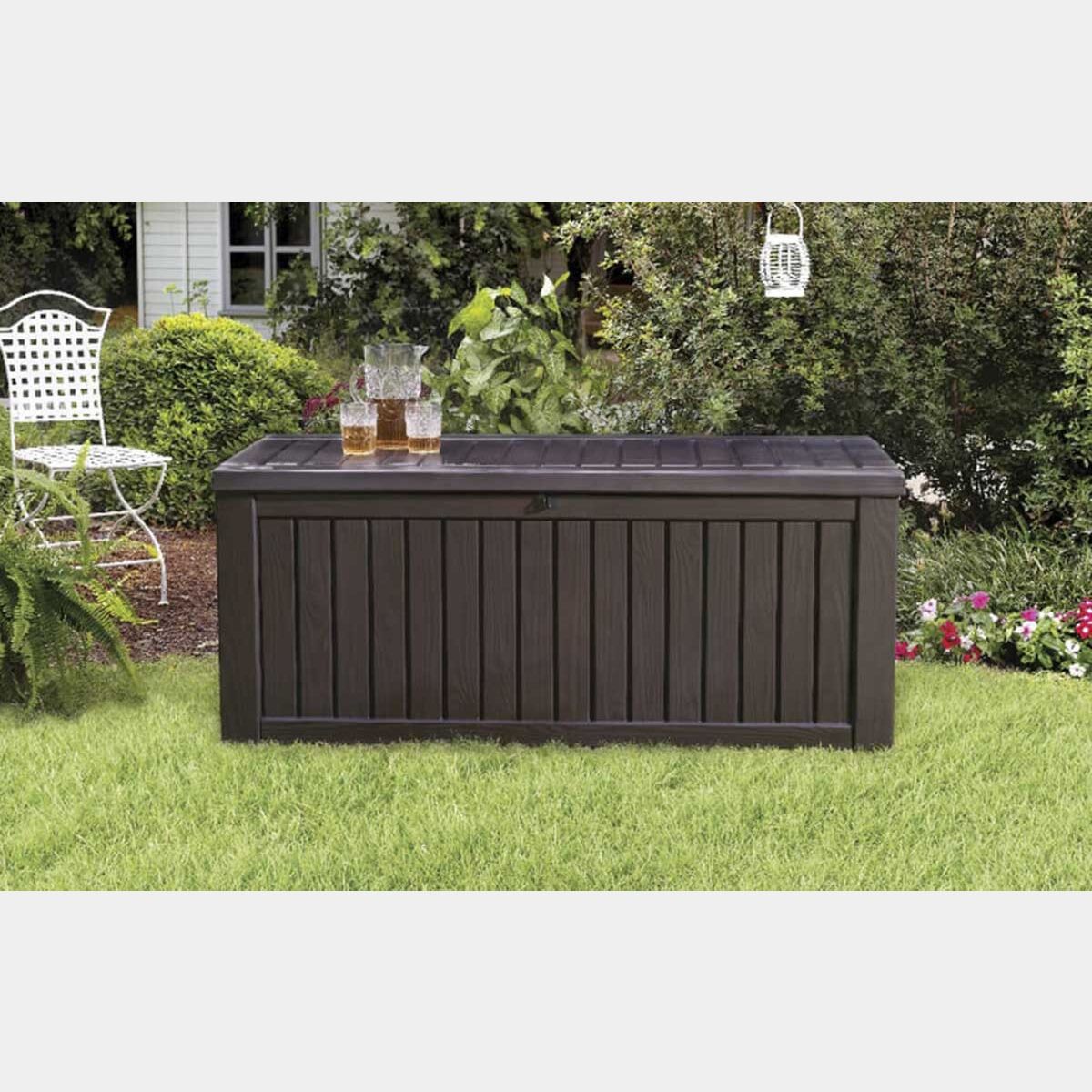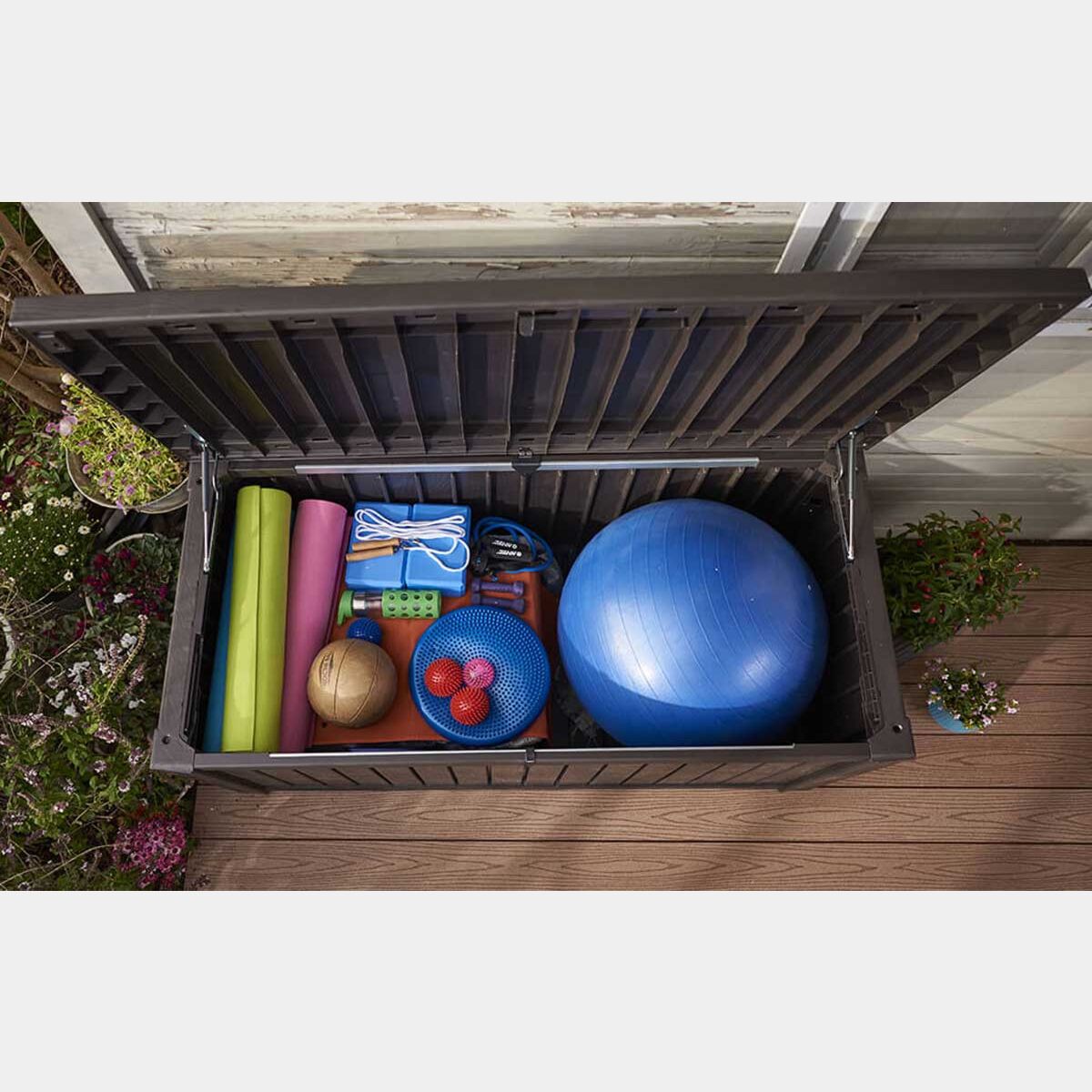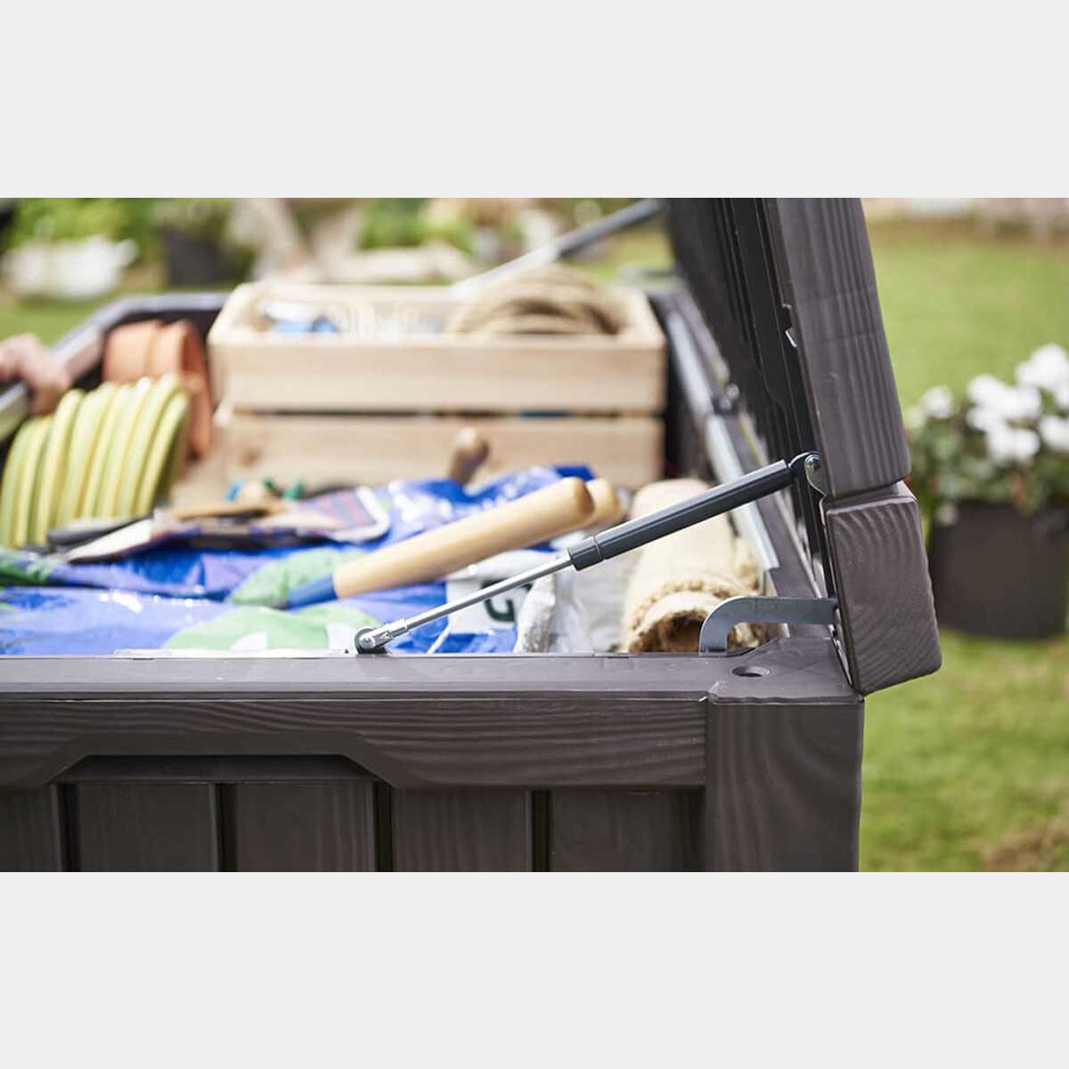 Che sia per riporre attrezzi da giardino, giochi da piscina o cuscini, Tiglio Marrone è la soluzione ideale grazie alla capacità di 570 litri. La comoda seduta sul coperchio per due adulti, rende Tiglio una soluzione versatile e pratica. Realizzato con resina durevole e resistente agli agenti atmosferici con un'elegante finitura effetto legno, mantiene il contenuto asciutto e ventilato aggiungendo, allo stesso tempo, un tocco di eleganza al tuo giardino.