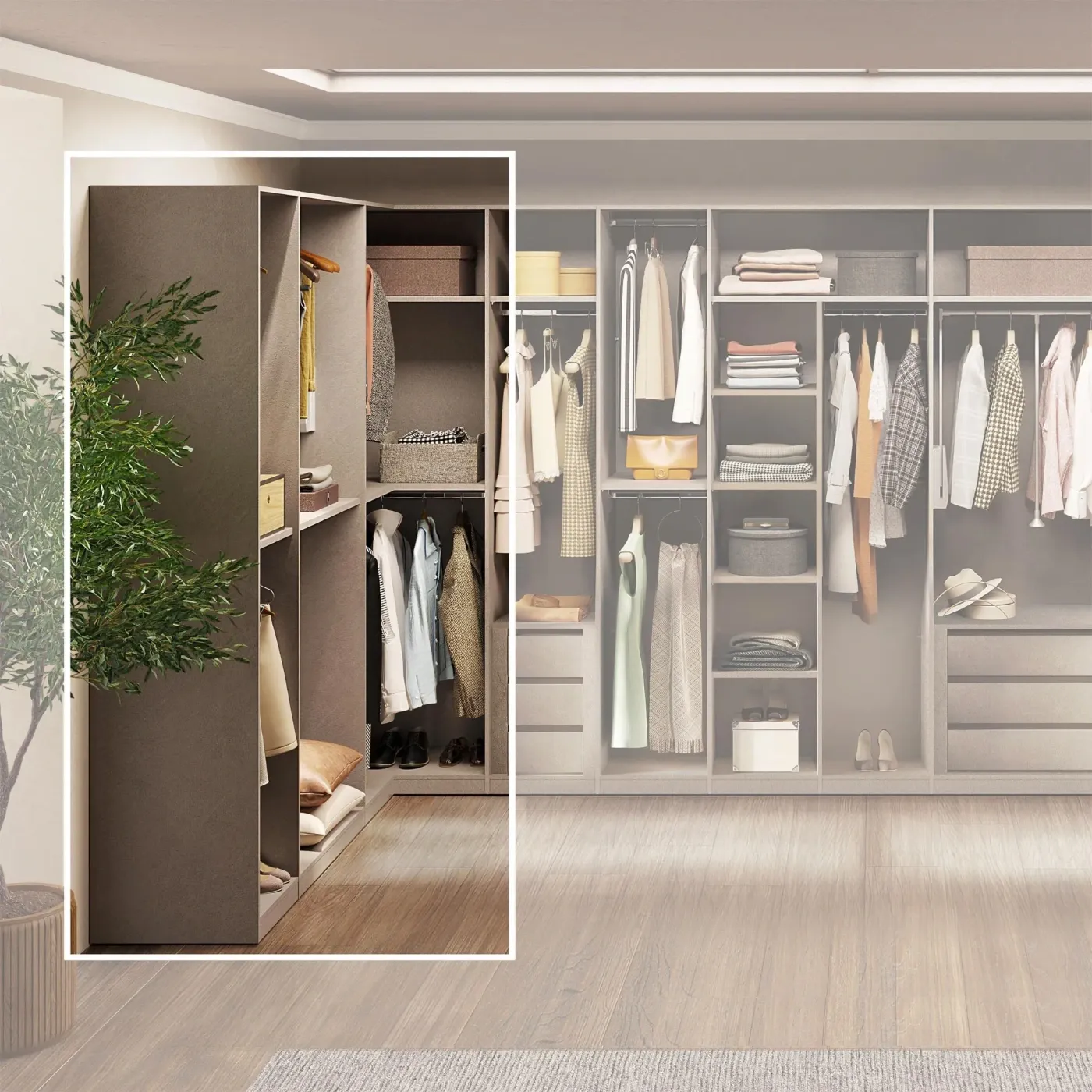 La finitura proposta, il Bronzo, può essere sostituita con altre tinte disponibili a campionario per personalizzare al meglio la cabina adattandola così alla propria camera da letto.