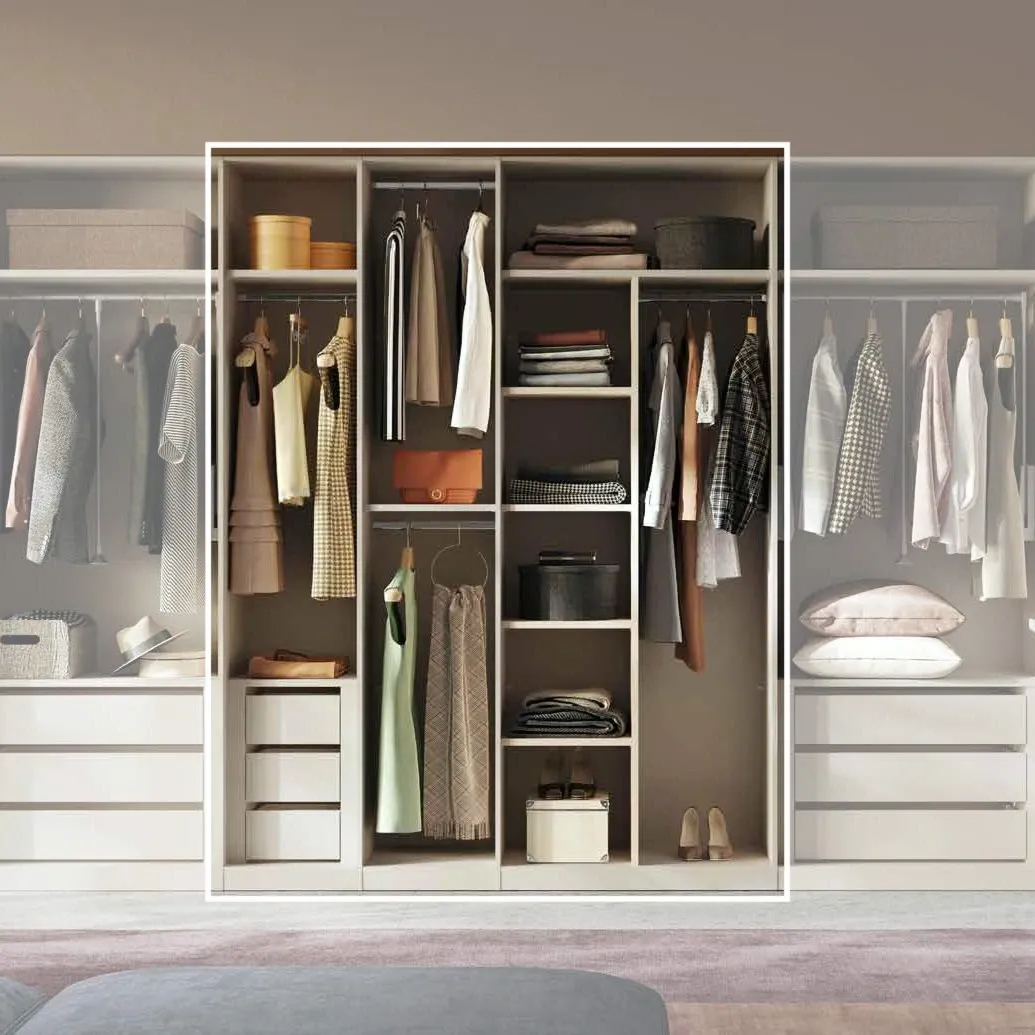 La cabina armadio a giorno è caratterizzata da numerosi ripiani, cassetti e tubi appendiabiti che offrono un ampio spazio contenitivo, perfetto per organizzare abiti, scatole, coperte e molto altro.