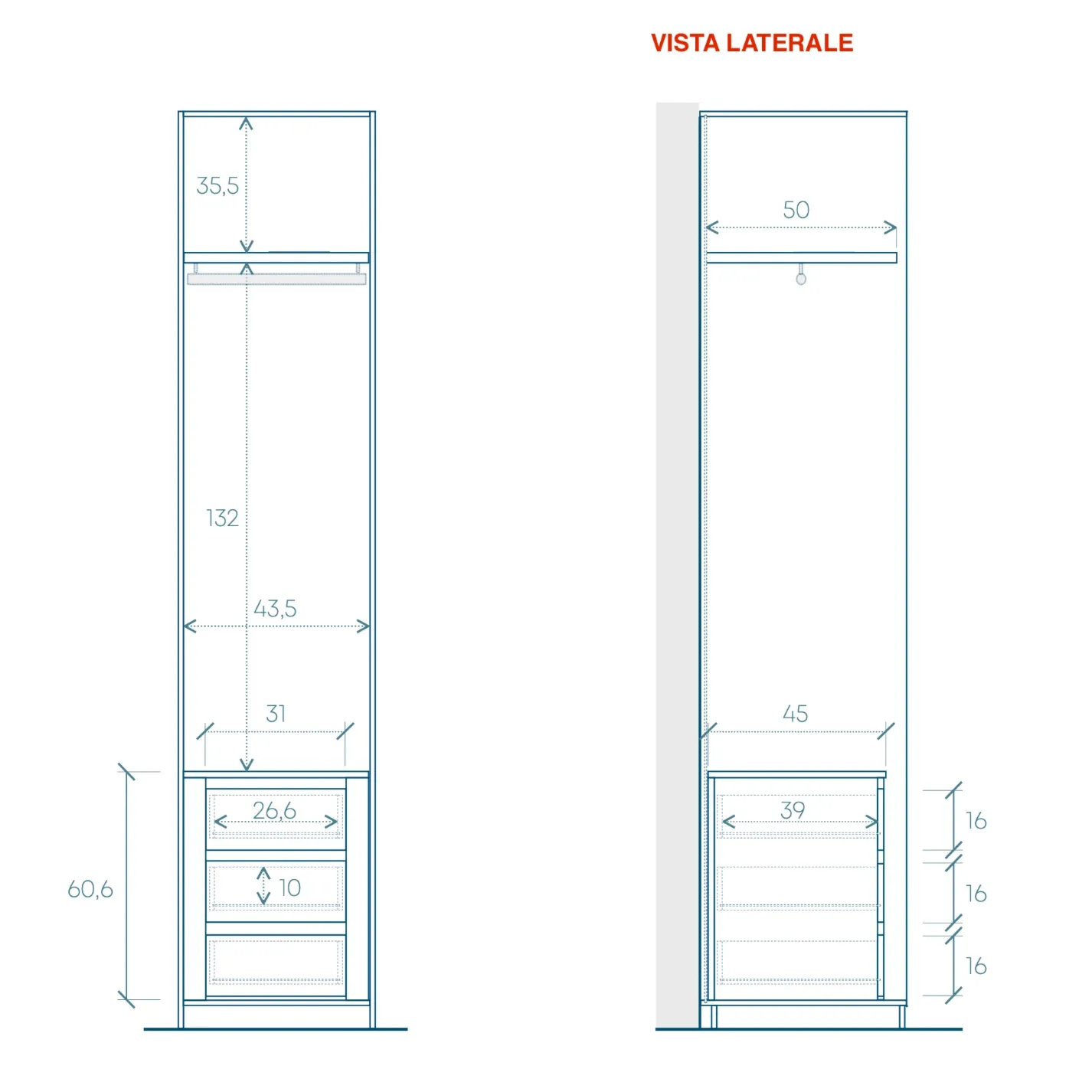La soluzione proposta è composta da 3 moduli: due da 45 cm ed uno da 90. Nel primo si trova una cassettiera a 3 cassetti ed un ripiano con tubo appendiabiti, nel modulo centrale sono previsti due tubi ed un ripiano, nel modulo da 90 è stata inserita una scaffalatura a quattro ripiani ed un ripiano superiore.