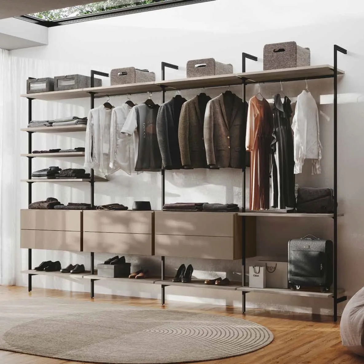 L'armadio è composto da una struttura a scaffalatura, con ripiani, cassetti e appendiabiti a vista. Questa soluzione offre una grande versatilità, permettendoti di organizzare i tuoi abiti e accessori in base alle tue esigenze.