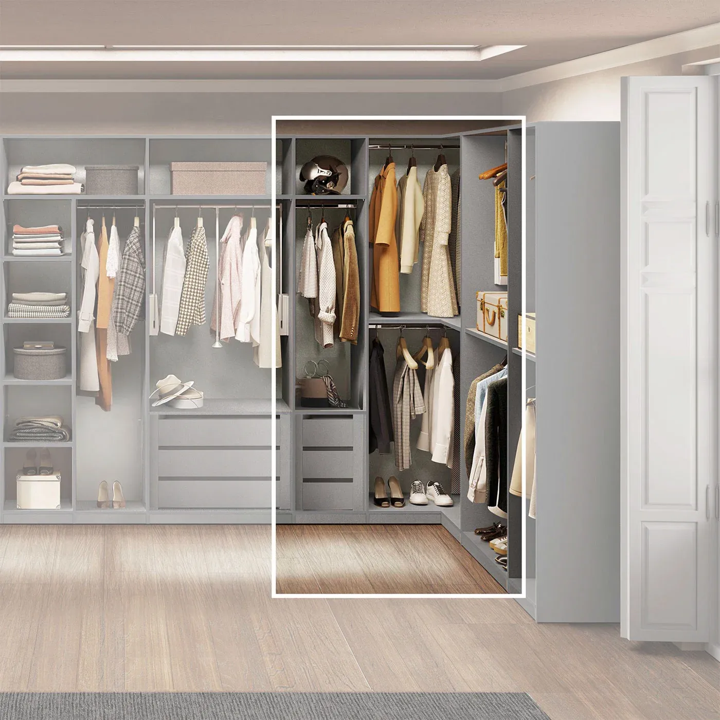 I numerosi elementi che compongono la cabina armadio assicurano ampio spazio contenitivo che ti consentirà di organizzare al meglio vestiti, coperte e oggetti vari.