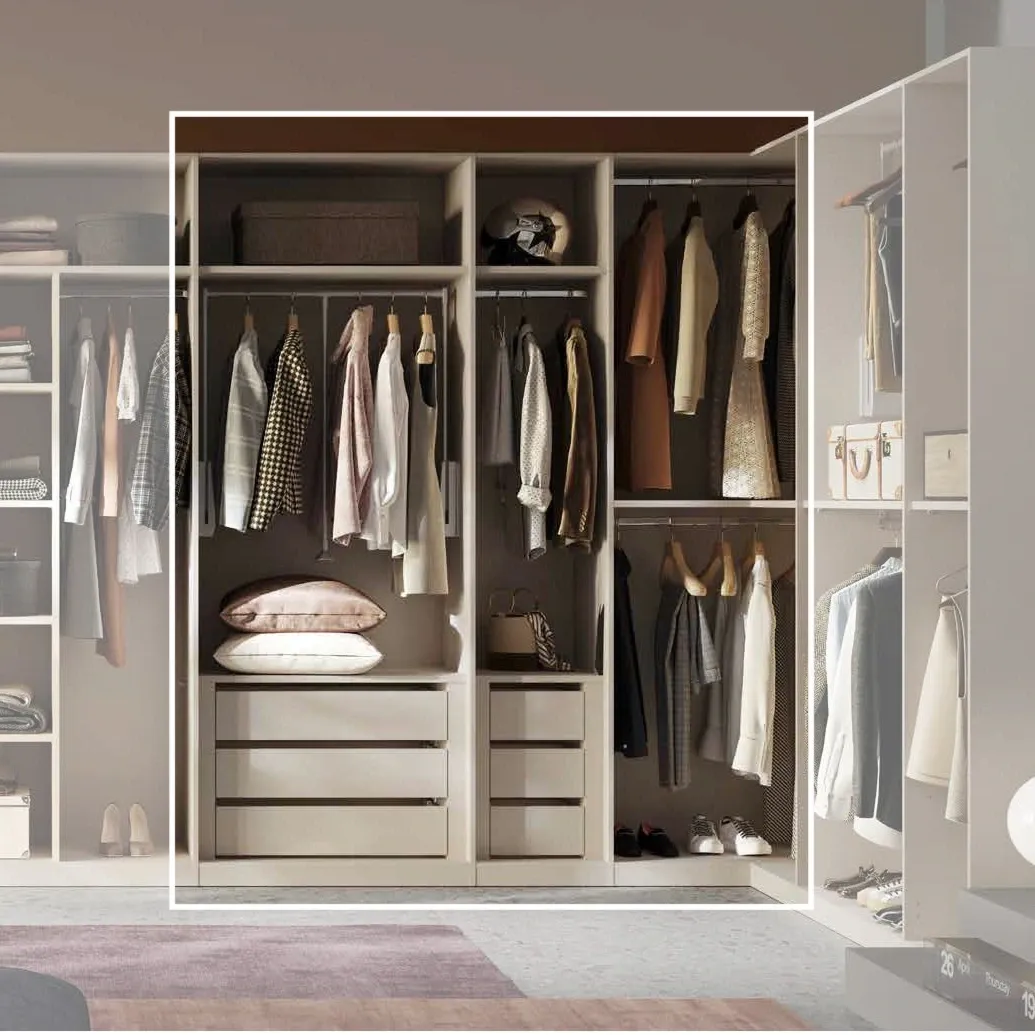 La cabina armadio è composta da diversi elementi modulari, tra cui ripiani, cassettiere e appendiabiti. Questa modularità permette di personalizzare la composizione in base alle proprie esigenze e allo spazio disponibile.