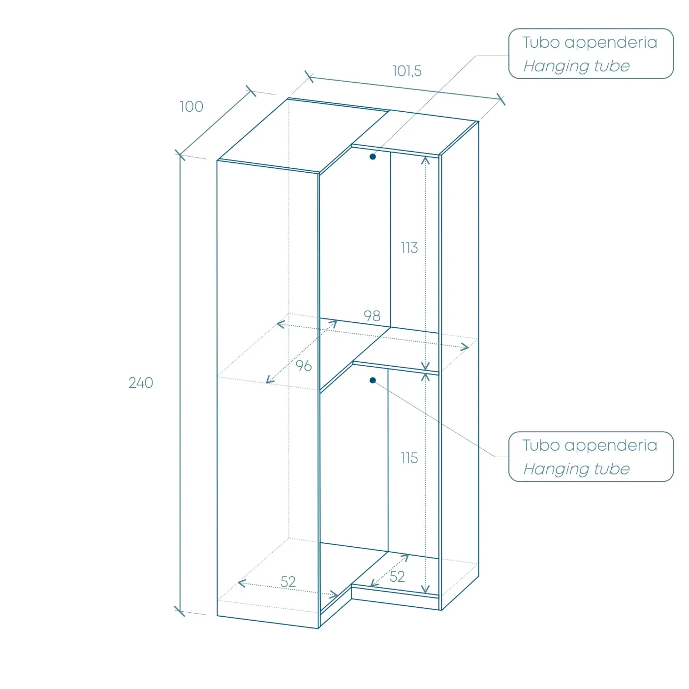 - Modulo angolare: ripiano angolare, 2 tubi appendiabiti