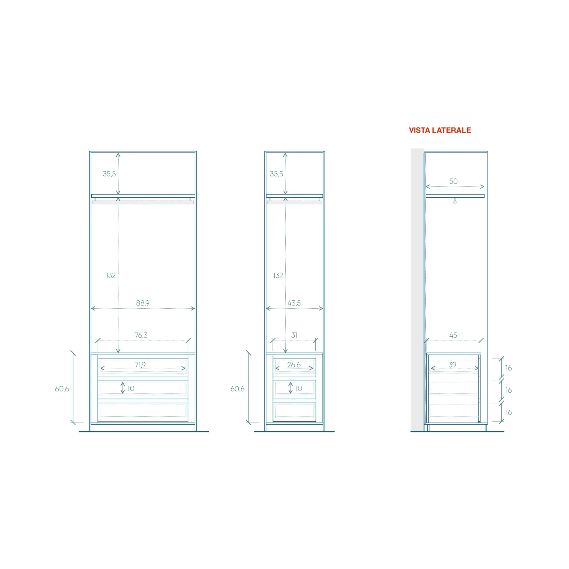 - Modulo 90: 1 ripiano (L.89 P.50 Sp.2,2), 1 tubo, cassettiera 3 cassetti