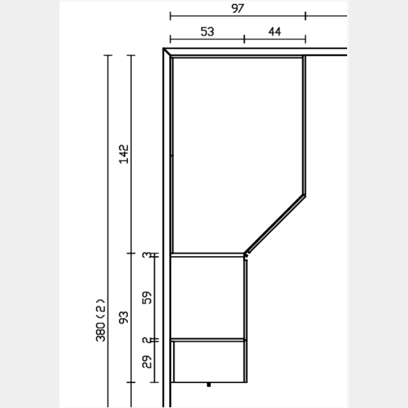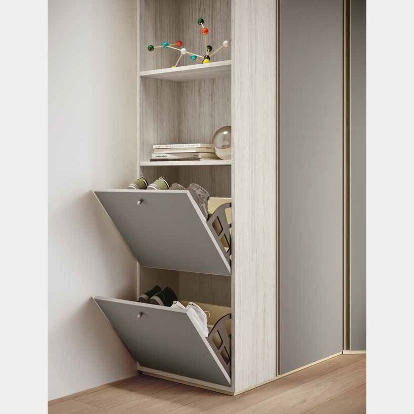 L'armadio viene fornito con un ripiano e due tubi appendiabiti per vano da 60 ed un ripiano angolare per la cabina. E' possibile personalizzare l'allestimento interno richiedendo ulteriori ripiani o le cassettiere interne. Elemento caratterizzante dell'armadio ad angolo è la libreria terminale: 3 ripiani superiori completano due ante a ribalta per riporre le scarpe.