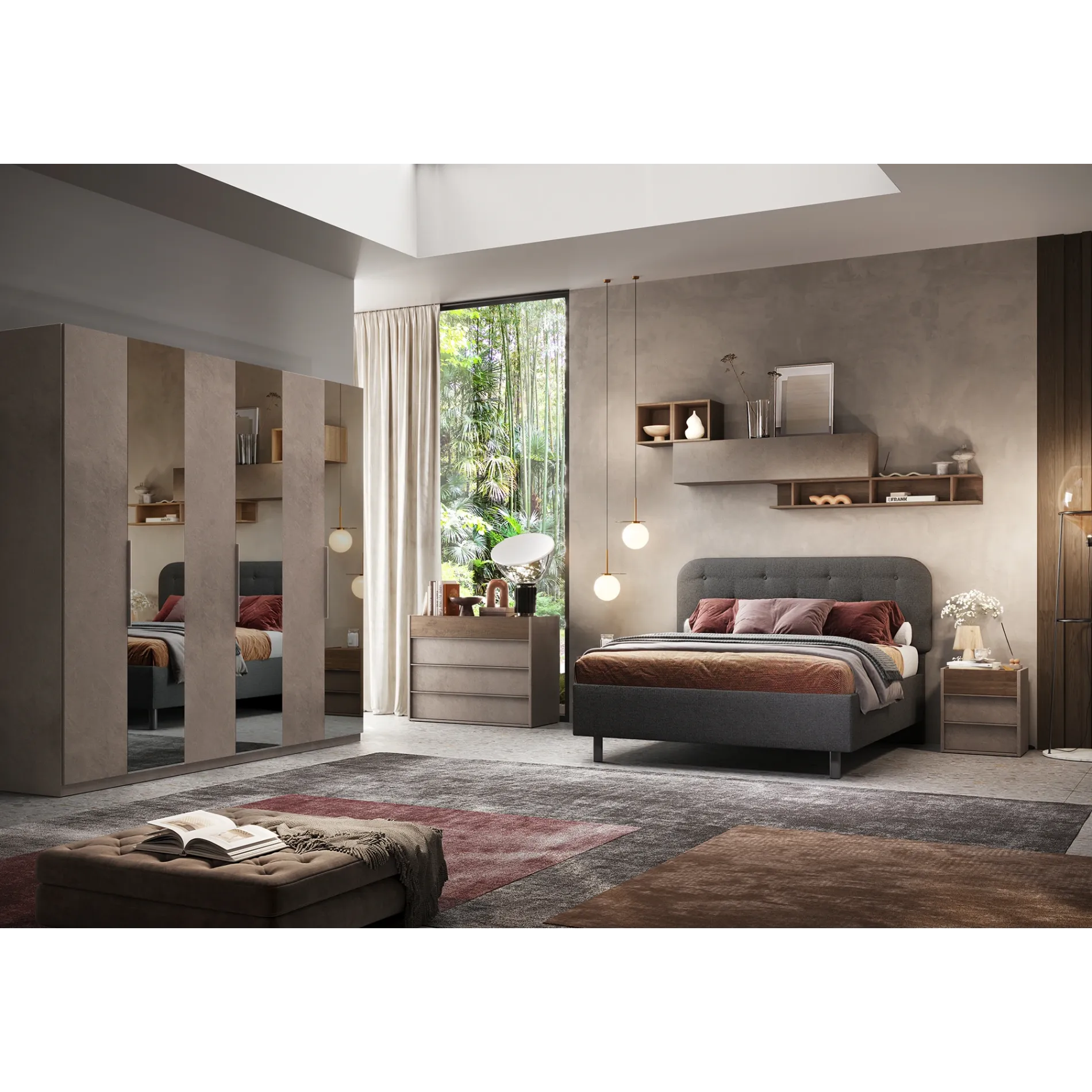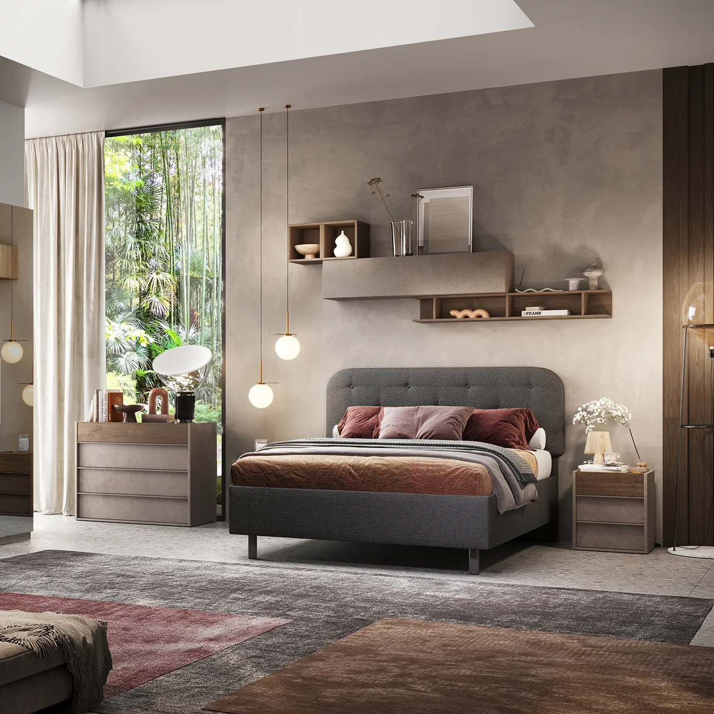 Camera matrimoniale Bronzo con letto in tessuto, collezione Mondo