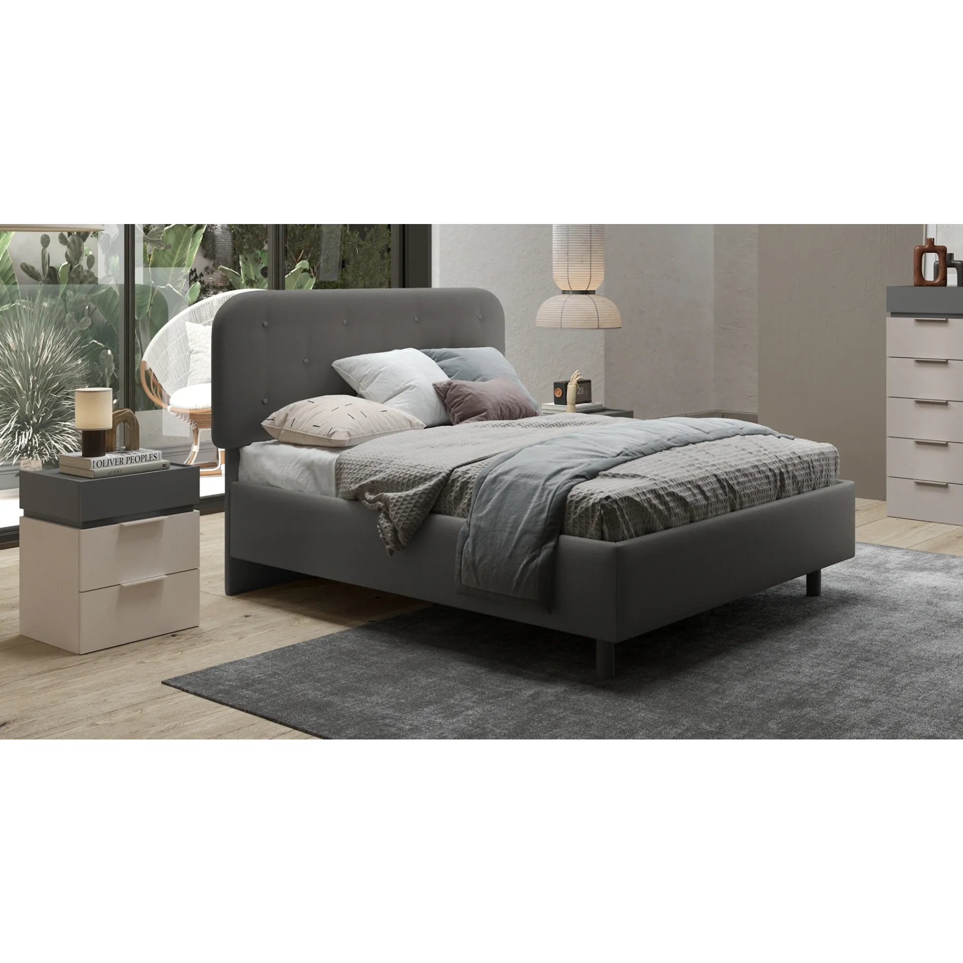 Il letto viene proposto in tessuto tinta Fumo, tonalità che ben si adatta al resto dei mobili e completa l'arredo con stile. Il letto supporta rete e materasso (non inclusi) dimensioni 160x195.