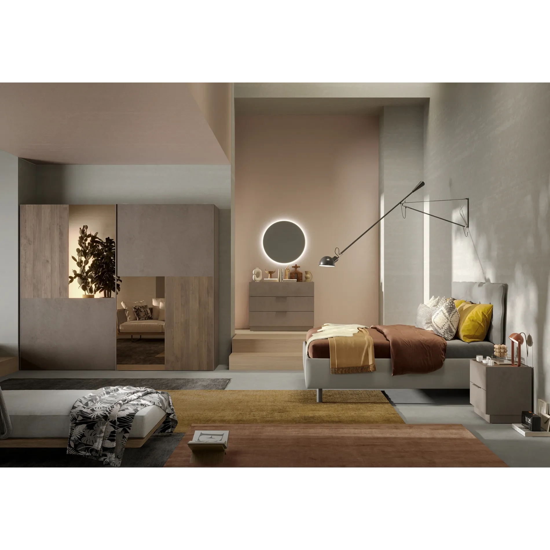 La camera matrimoniale è dotata di un armadio a due ante scorrevoli, un letto in tessuto ed una coppia di comodini. Scopri tutta la collezione Mondo!