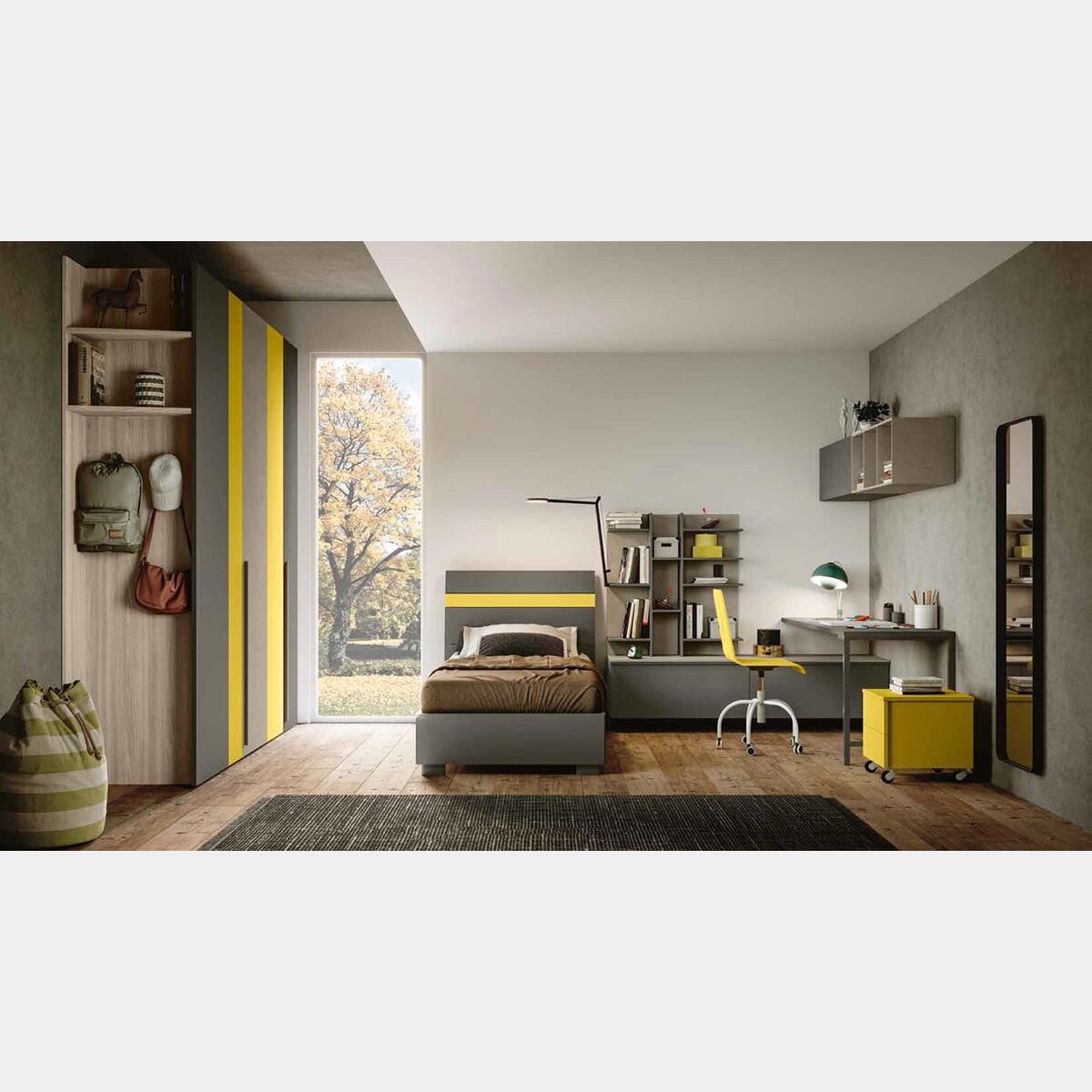 Cameretta colorata per ragazzi, fintiura Grigio cenere, Olmo natura e Giallo cedro