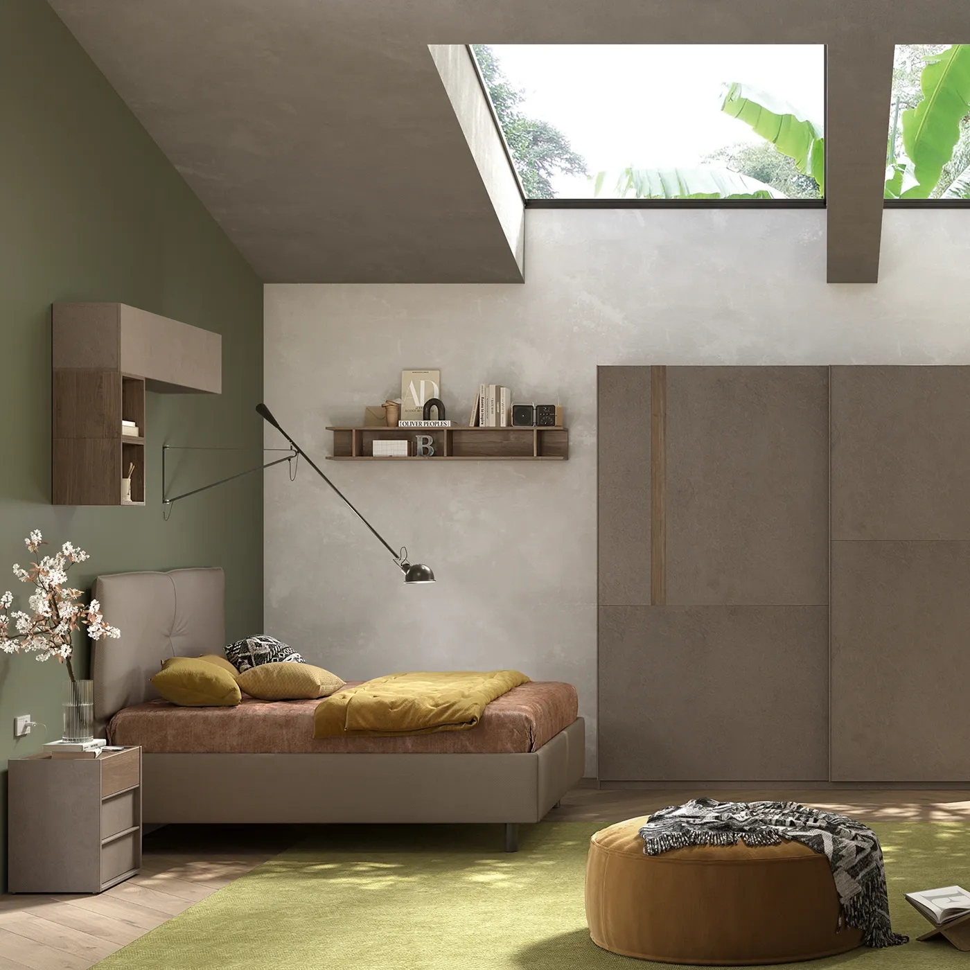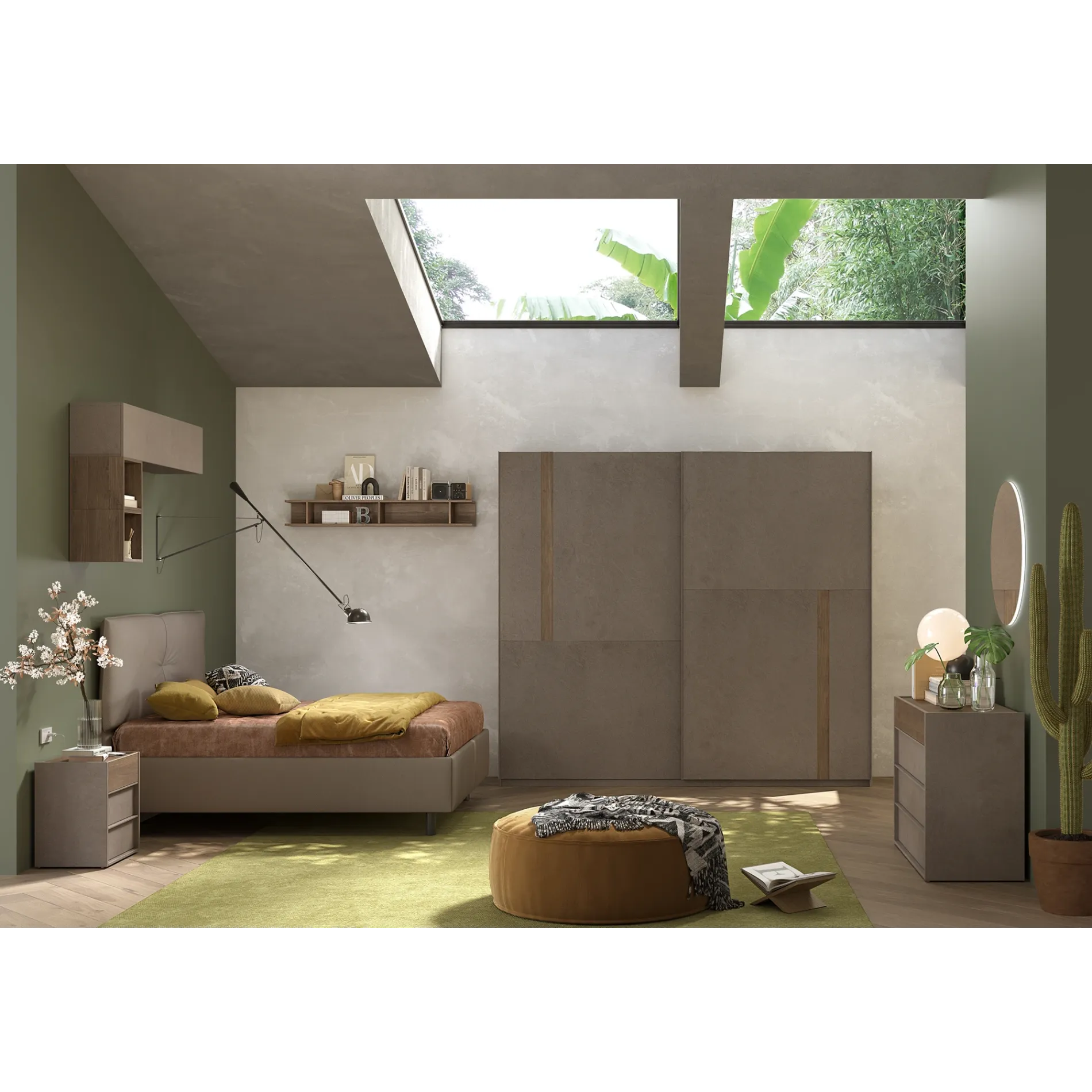 La camera da letto è composta da un armadio a 2 ante scorrevoli , una coppia di comodini in Bronzo e Mercure ed un letto in tessuto Tortora. Scopri tutta la collezione Mondo!