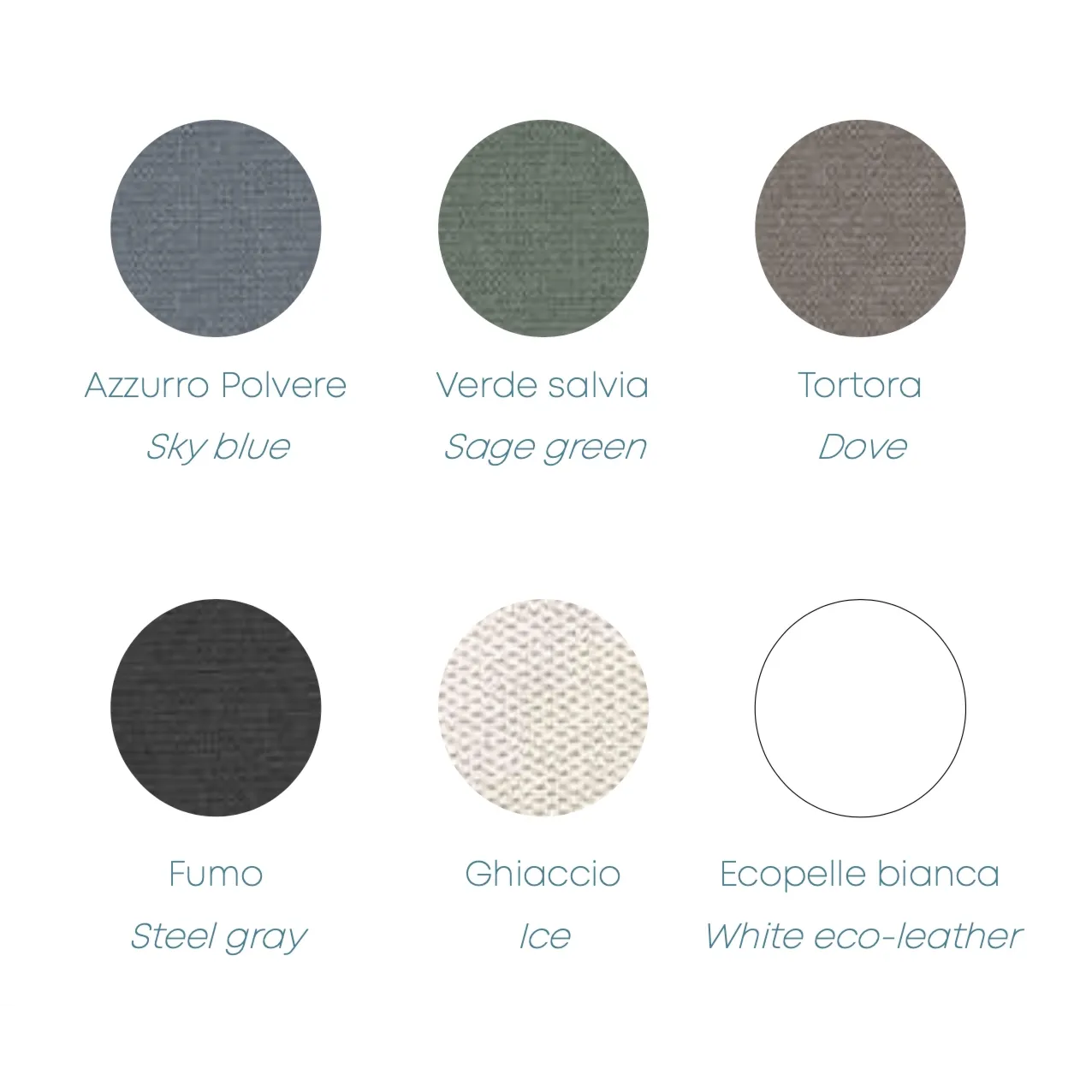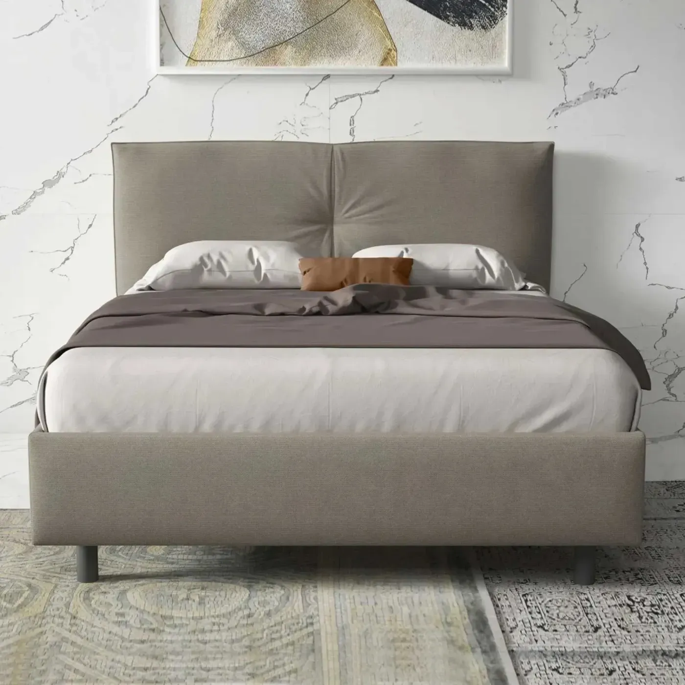 Il letto viene proposto in tessuto tinta Tortora, tonalità che riprende la nuance di armadio e comodini, completando l'arredo della camera da letto con gusto.