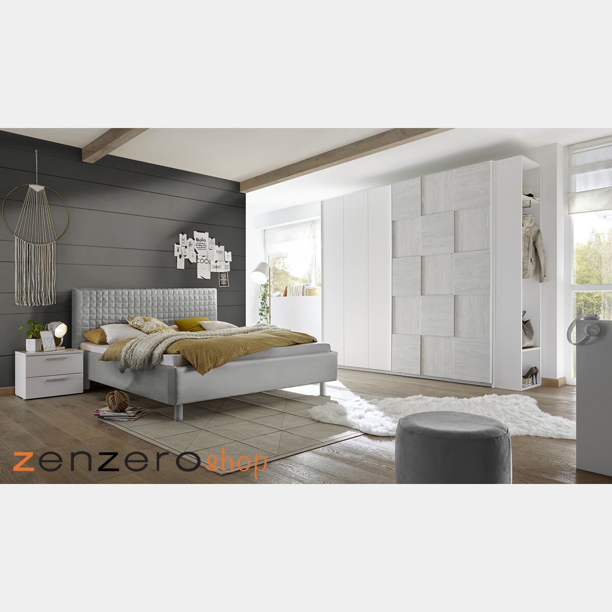 Camera dal letto completa moderna con letto in tessuto imbottito color grigio, armadio a 2 ante scorrevoli e comodino a 2 cassetti.