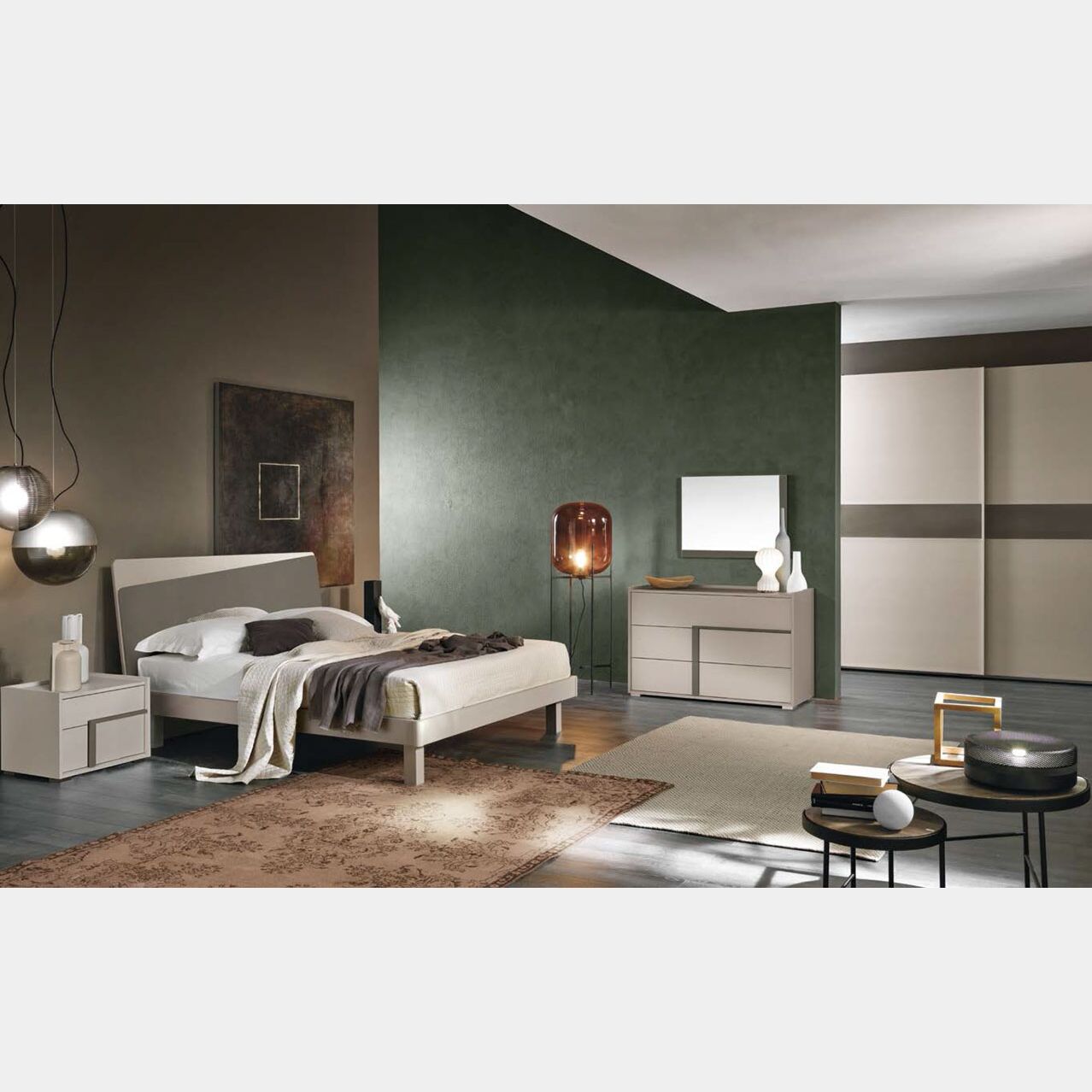 L'armadio presenta due grandi ante da 135 cm ciascuna con meccanismo di chiusura ammortizzata, provviste internamente di 2 ripiani mobili e 4 tubi appendiabiti. La fascia orizzontale che lo percorre in tutta la sua lunghezza riprende comò, comodini e testata del letto rendendo tutta la camera armoniosa ed elegante. Il comò ed i due comodini presentano capienti cassetti il cui interno è trama madreperla, sono dotati di guide ammortizzate. Il letto matrimoniale, che supporta una rete da 160x190, presenta un pannello Grigio londra.