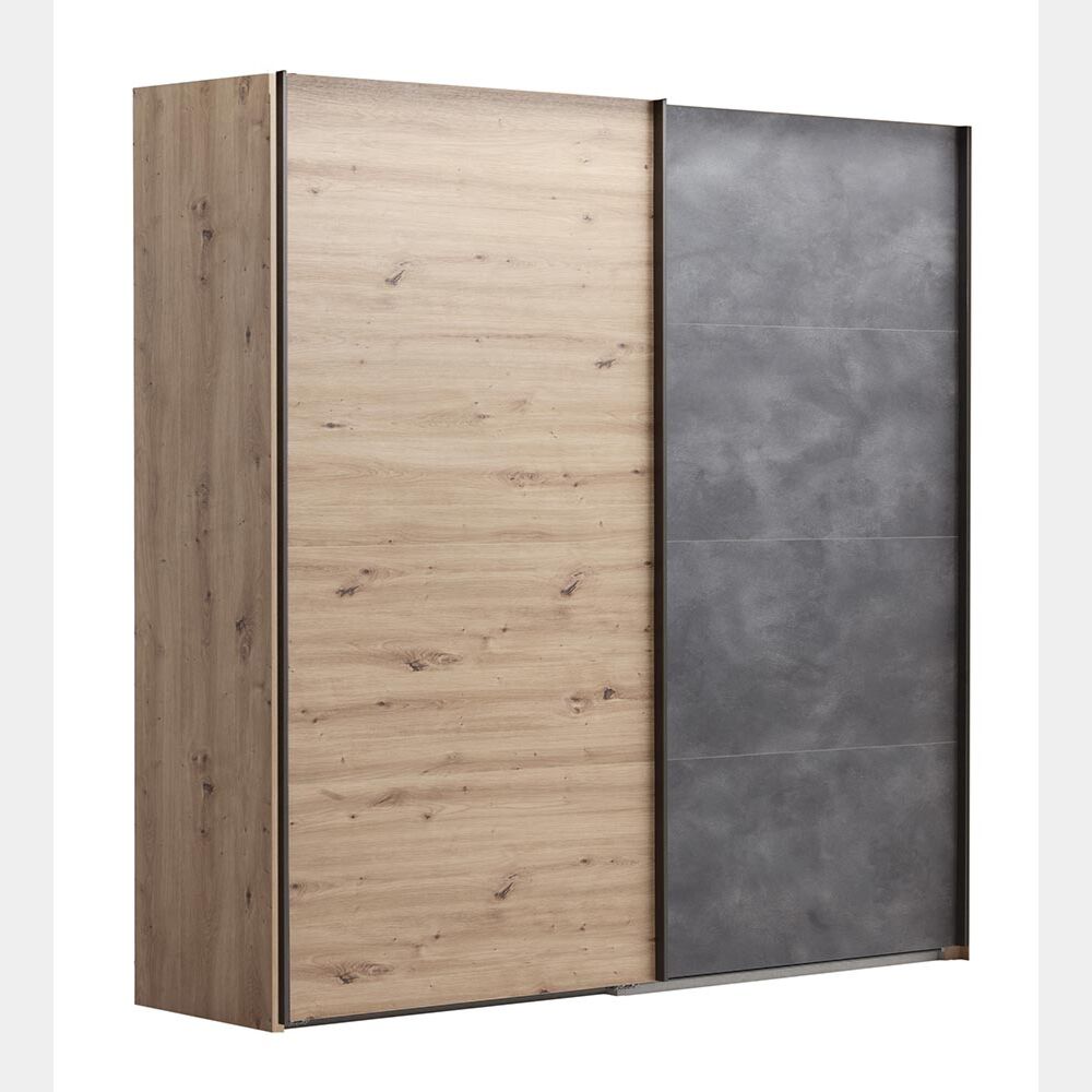 L'armadio presenta 2 ante scorrevoli, la dotazione interna prevede un ripiano e un tubo appendiabiti per anta. Come optional è possibile aggiungere una coppia di ripiani, una cassettiera e gli ammortizzatori per rallentare la chiusura.