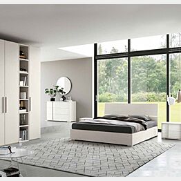 Camera dal letto completa moderna con letto, armadio e comodini. La camera completa si presenta in due finiture. Bianco lucido e larice bianco. L'armadio è completamente in finitura larice bianco, mentre il comò e i comodini hanno la scocca in finitura larice bianco e i cassetti in bianco nobilitato.
