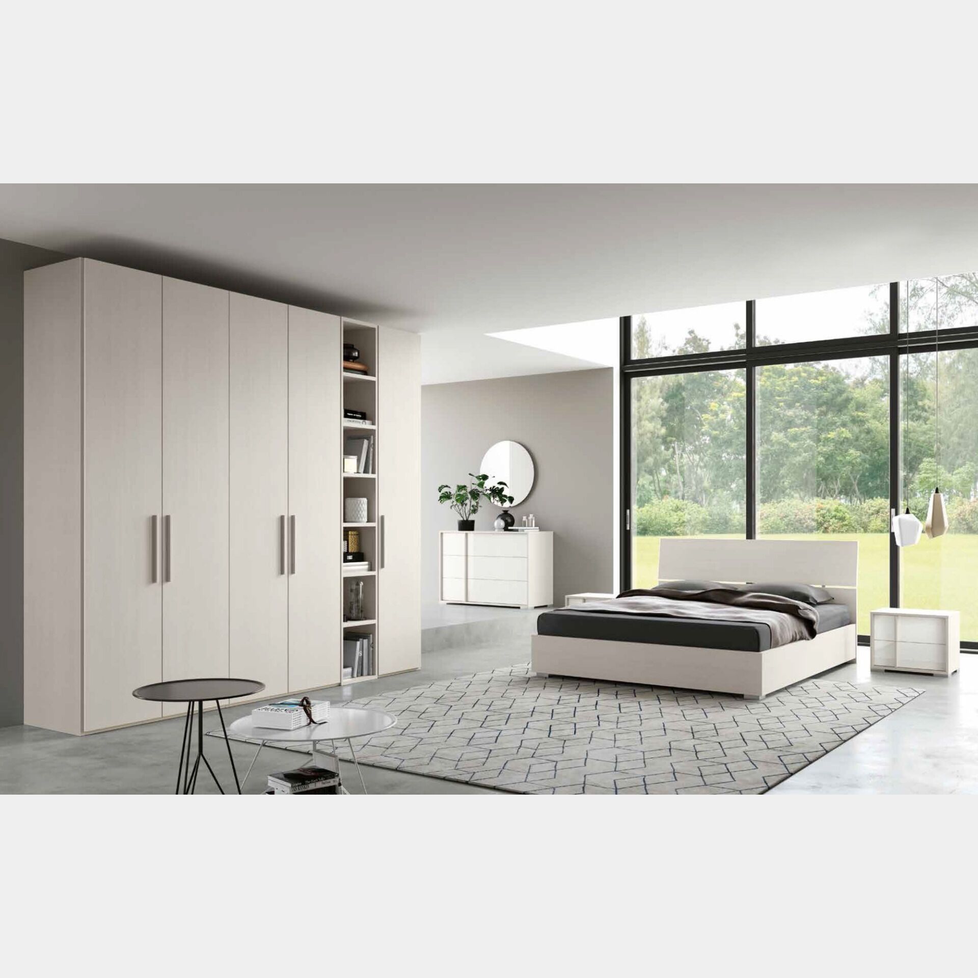 Camera dal letto completa moderna con letto, armadio e comodini. La camera completa si presenta in due finiture. Bianco opaco e larice bianco. L'armadio è completamente in finitura larice bianco, mentre il comò e i comodini hanno la scocca in finitura larice bianco e i cassetti in bianco opaco.