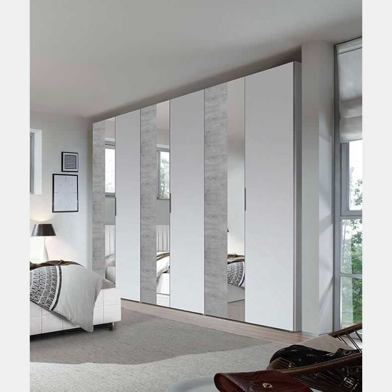 L'armadio battente per arredare la zona notte è composto da 6 ante battenti con 3 delle quali a specchio. La struttura esterna dell'armadio e 3 ante su 6 sono in finitura Bianco Opaco, mentre le ante prive di maniglia sono divise tra una finitura Beton e uno Specchio.