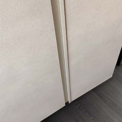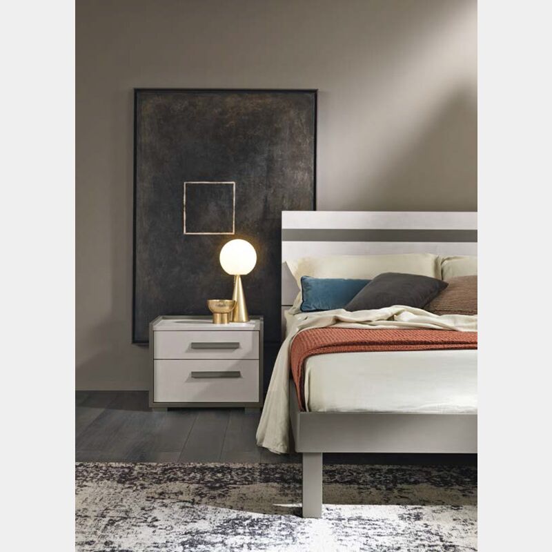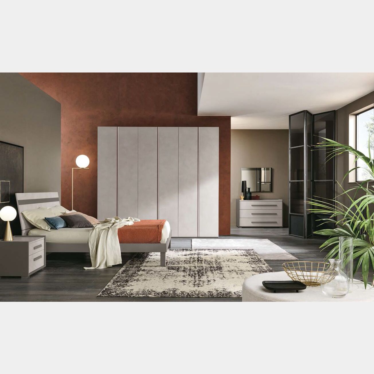 L'armadio presenta 6 ante battenti con chiusura ammortizzata di serie. Le particolari maniglie percorrono tutta l'altezza dell'armadio catturando l'attenzione. L'allestimento di base prevede un ripiano e due tubi appendiabiti per anta, è però possibile personalizzarlo aggiungendo altri ripiani, servetti e cassettiere. Il letto matrimoniale presenta Calce che viene attraversata da un inserto in Grigio londra, come il giroletto. Pensato per arredare e personalizzare la camera da letto offre il giusto comfort e accoglienza, indipendabile per un utilizzo quotidiano. E' possibile richiedere la rete a doghe fissa (160x190) oppure la versione con contenitore.