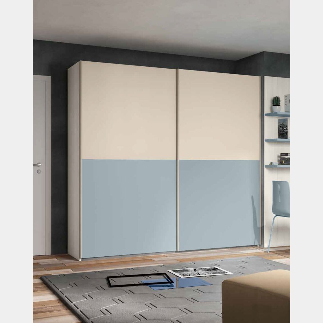 Armadio scorrevole proposto nella versione 2 ante per rispondere alla massima funzionalità per l’intera parete della camera ma anche in servizio su un corridoio o un passaggio. Le finiture di ante e scocca sono di categoria Essenze e Colorati ma possono essere scelti di finiture diverse, permettendo di posizionare l'armadio in camere matrimoniali o camerette per ragazzi.