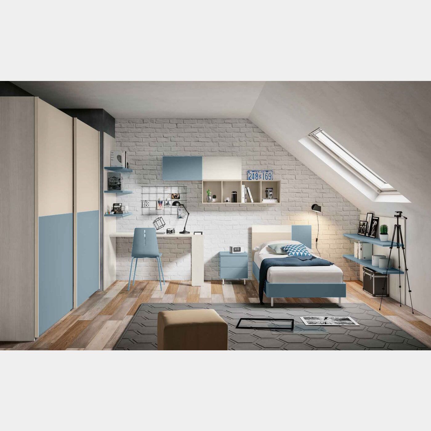 Cameretta moderna per ragazzi composta da un armadio, letto e comdino in finitura bianco, orzo e blu avio.
