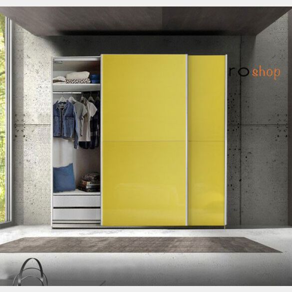 La struttura degli armadi è in finitura melaminico Bianco Avatar con ante Giallo Lucido.