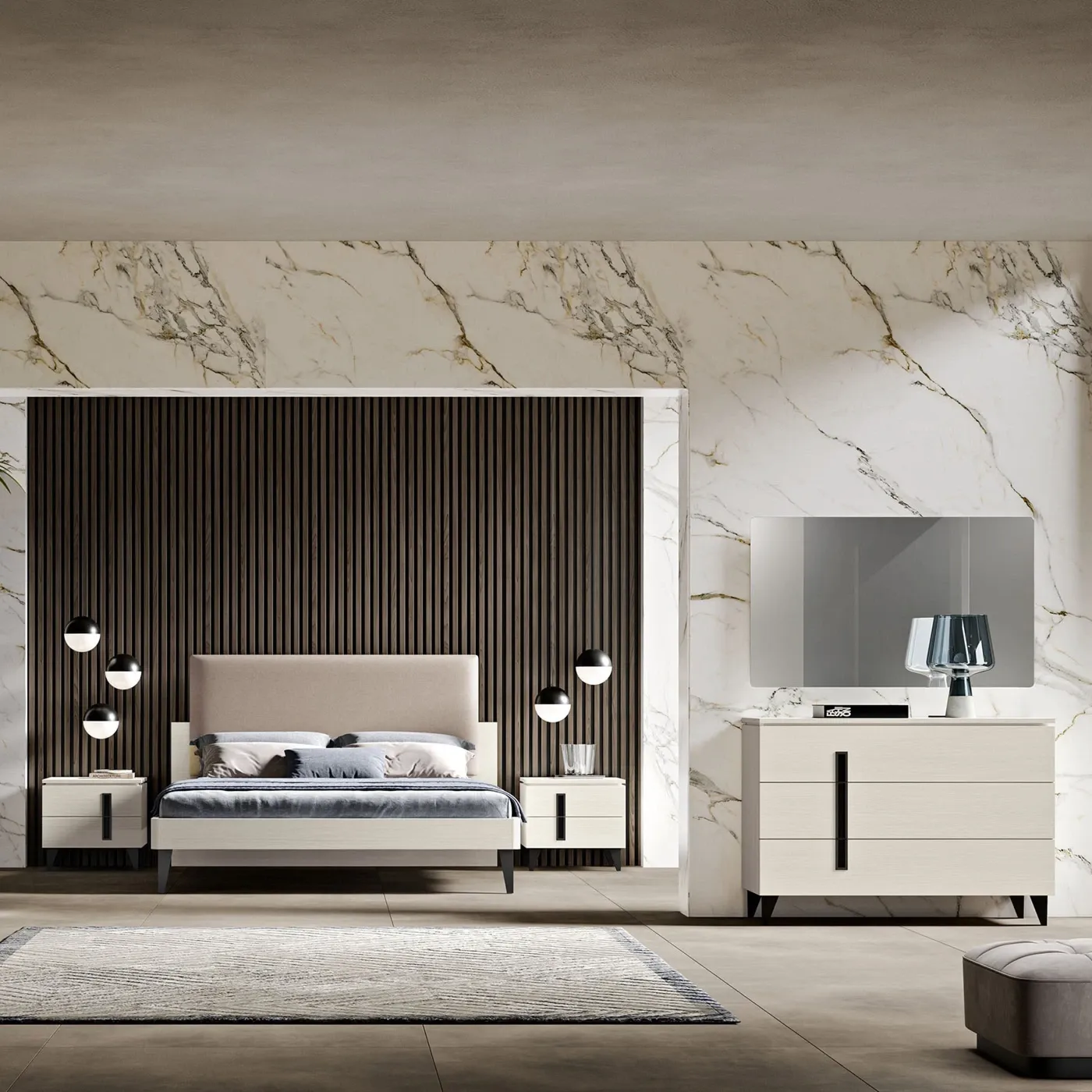 Camera da letto moderna con armadio con ante a vetro, letto matrimoniale, comò e comodino, finitura Bianco Vanguard. Scopri tutta la collezione Apache!