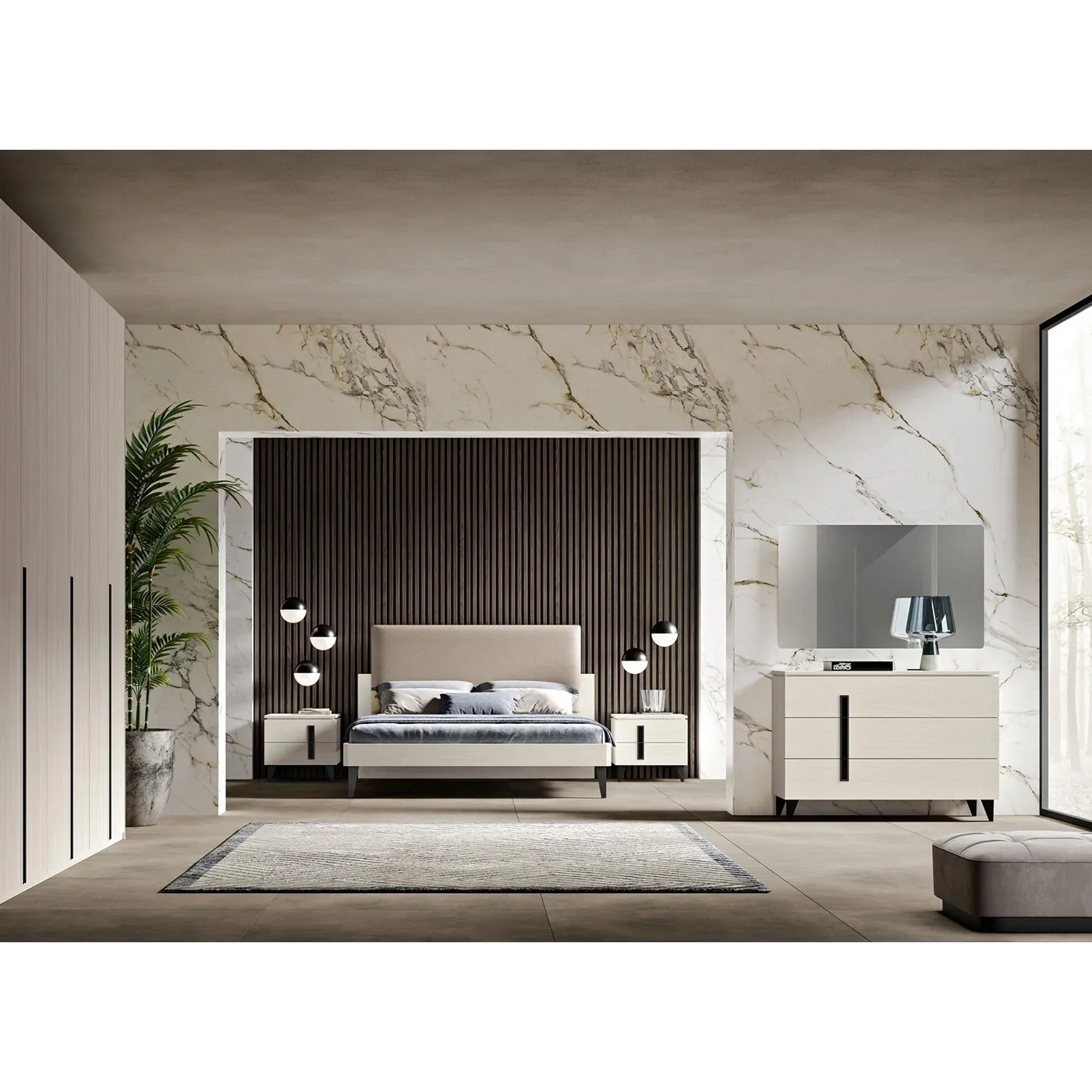 - Un letto matrimoniale, un prodotto capace di unire eleganza e carattere con una testata dal design distintivo, dove un ampio pannello in legno si combina armoniosamente con un elemento più piccolo e raffinato, imbottito in tessuto Beige.