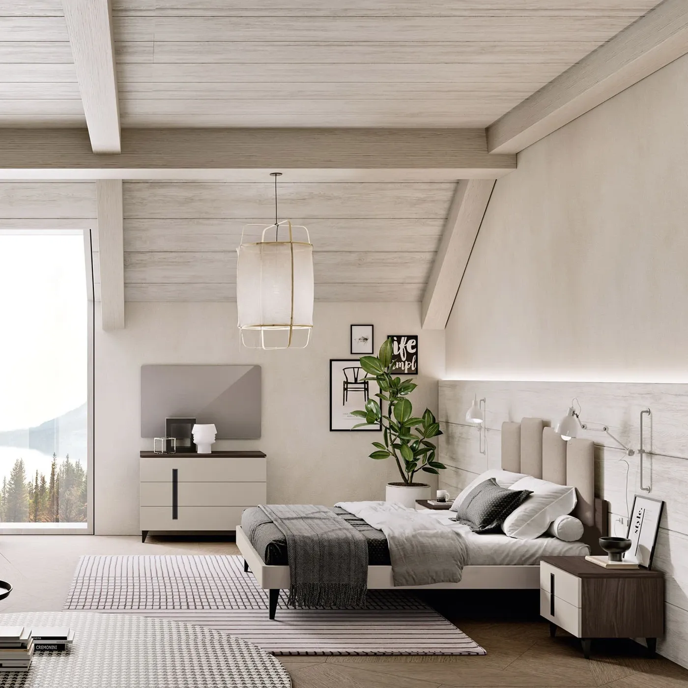 - un letto matrimoniale dalla testata composta da un pannello posteriore in Noce Vanguard, il quale fa da sfondo a 4 pannelli frontali separati, splendidamente imbottiti e rivestiti in un sofisticato tessuto Beige.
