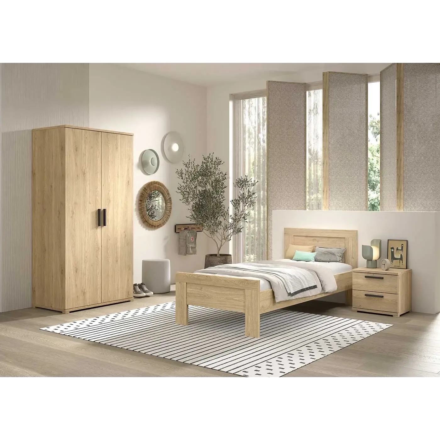 La rete a doghe non è inclusa. Il prodotto è campione in fatto di versatilità e praticità: il comodino ha 2 ampi cassetti con maniglie metalliche color Nero contenitori per riporvi oggetti personali o di qualsiasi altro tipo si voglia; l'armadio a 2 ante offre ampio spazio di archiviazione e include 2 ripiani e un'asta appendiabiti; il letto infine, grazie alla sua particolare struttura, consente di dormire sonni tranquilli ed immersi nel relax.
