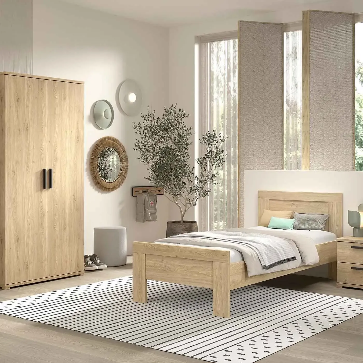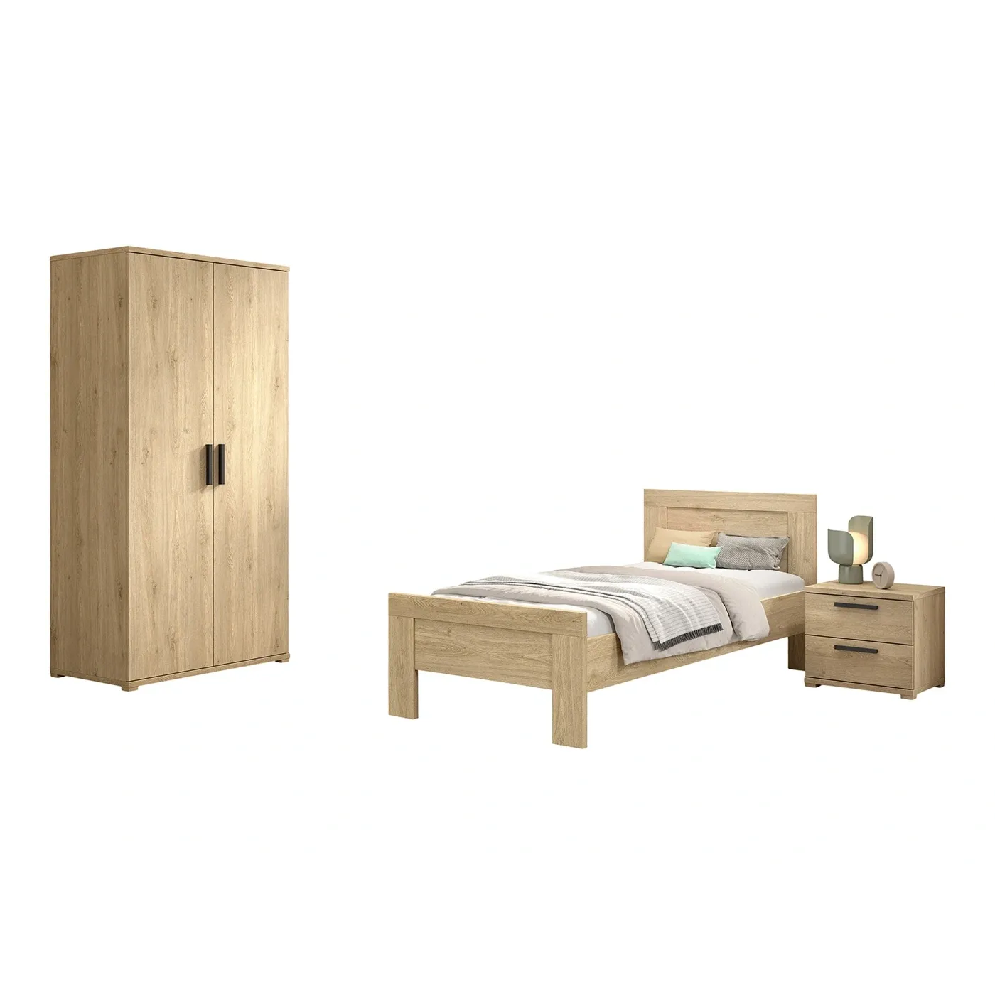 Camera con letto, comodino e armadio, finitura Rovere