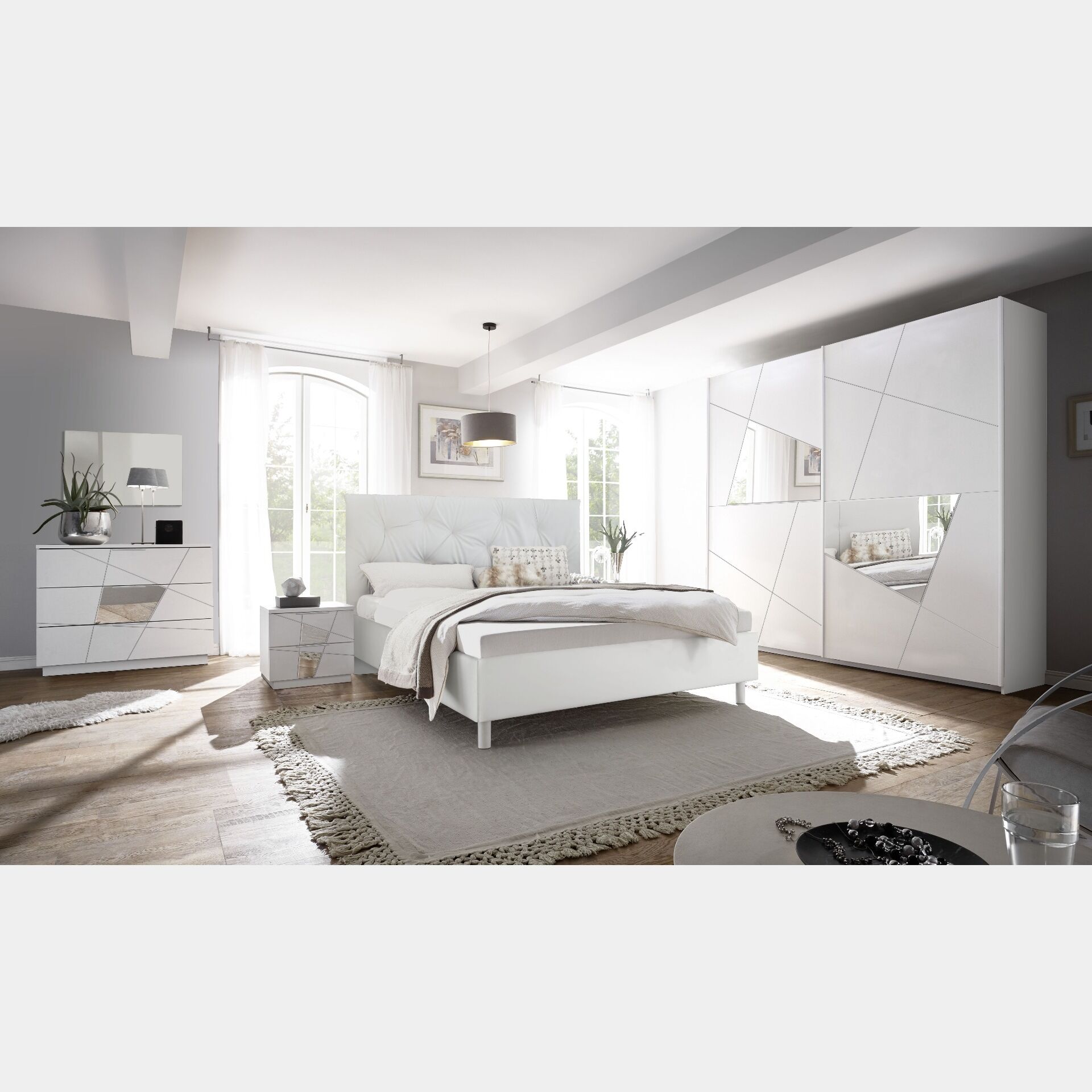 Pensato per una zona notte moderna e ricercata la camera matrimoniale moderna offre la soluzione perfetta che coniuga la praticità neccessaria nel quotidiano all'estetica unica del design italiano. L'armadio, la coppia di comodini ed i comò presentano delle serigrafie che creano motivi geometrici e in alcuni di questi è inserito uno specchio lucido incassato in rilievo. La finitura è in Bianco.