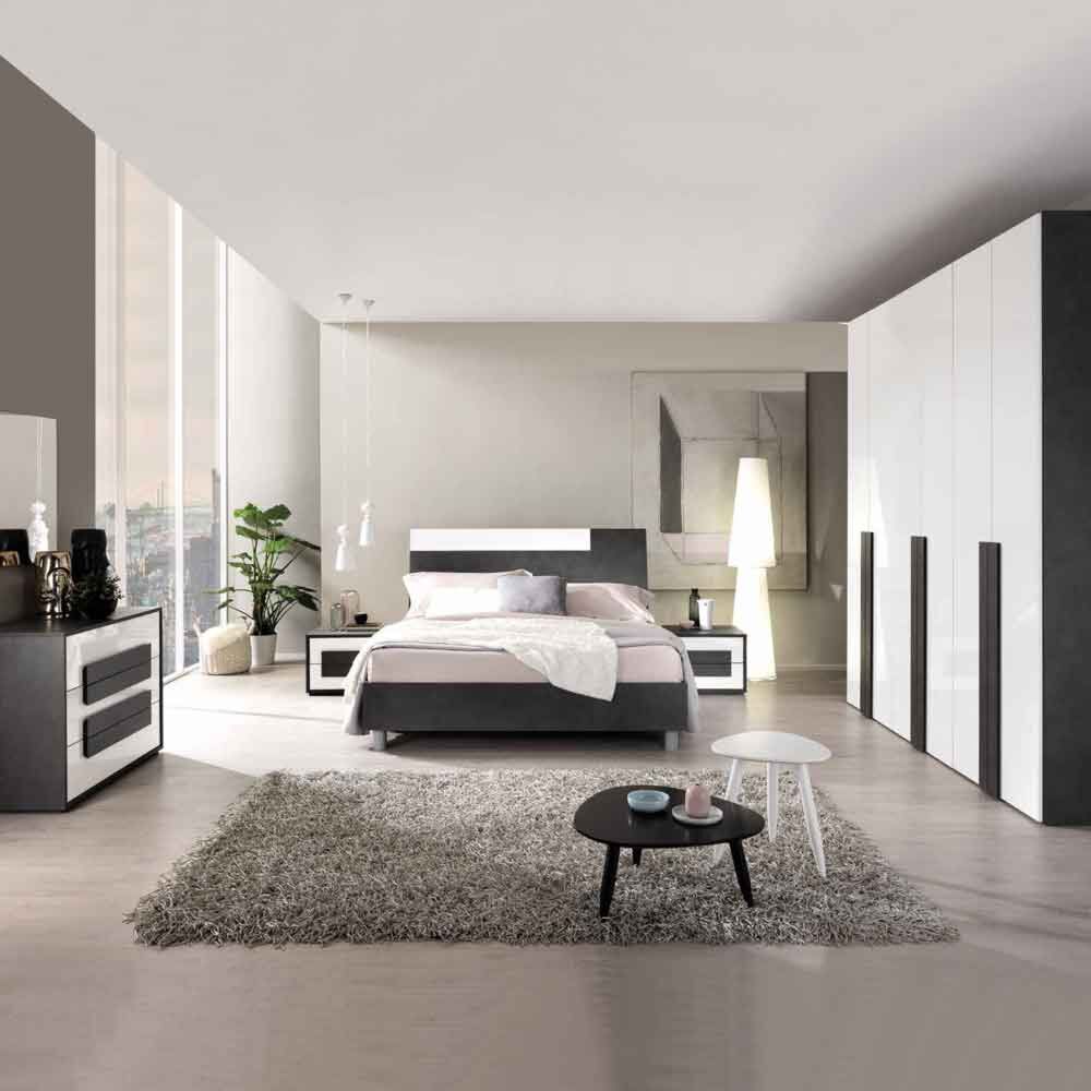 La camera da letto è composta da un armadio a 6 ante battenti, un letto matrimoniale, la coppia di comodini ed il comò. Il contrasto generato tra scocca e frontali assicura un forte impatto che caratterizza la zona notte.