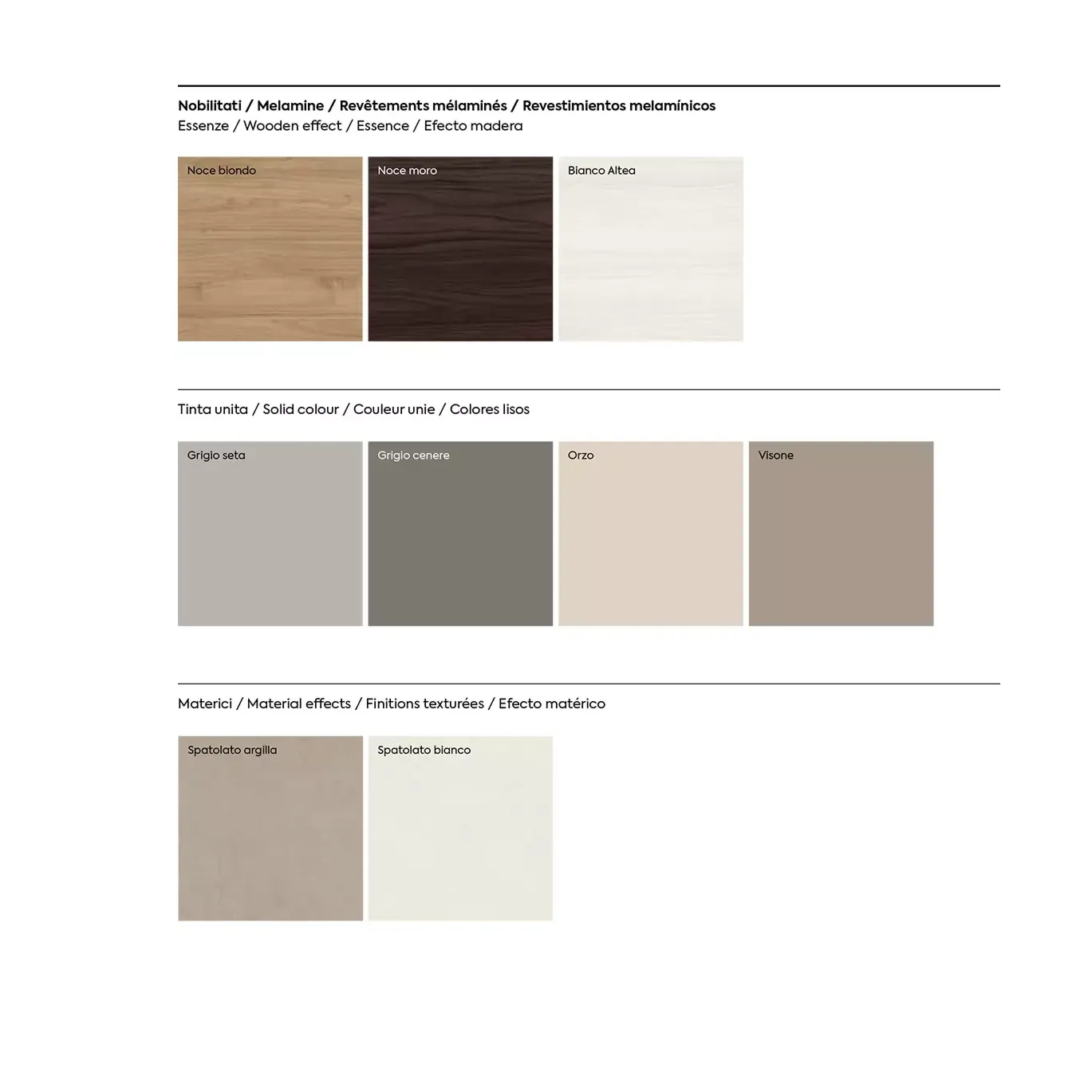 Comò e comodini: prodotto con pannelli a bassa emissione di formaldeide, certificati E1. Forniti montati, guide ammortizzate portata 30Kg, dotati di piedini registrabili e anti ribaltamento, spessore cassa 18 mm, spessore frontali 38 (18+ maniglia)