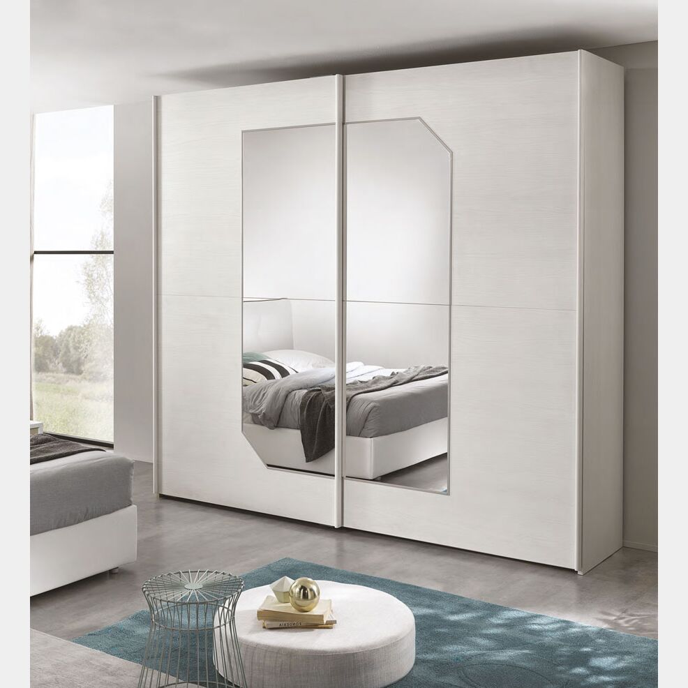 Camera da letto economica completa, composta da armadio 2 ante scorrevoli olmo bianco con specchi, letto contenitore, comodini e settimino colore Olmo Bianco con dettagli visone, è un arredo Made in Italy.