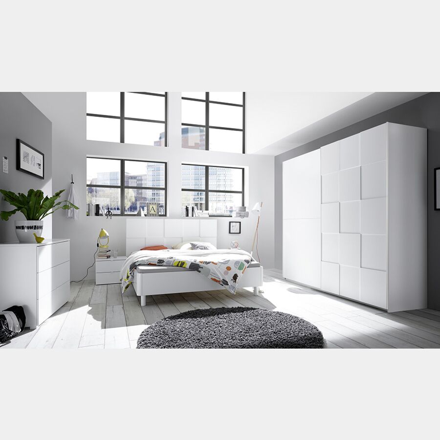 Camera in linea con le tendenze moderne del momento. La camera è completa di letto, armadio e 2 comodini. E' possibile acquistare il comò come optional. Il letto così come l'armadio ha testiera e anta lavorate con forme geomentriche, rendendola una camera di design. La camera è tutta in bianco opaco.