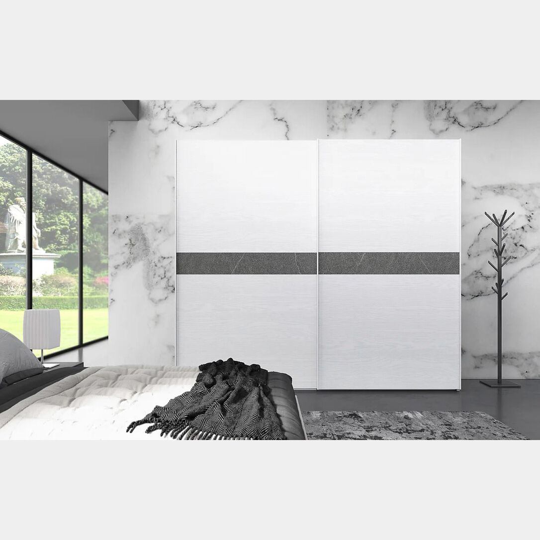 - Il maxi armadio scorrevole in finitura in Frassino gesso con dettaglio del fascione color Pietra. La sua modesta struttura ti permetterà di ottimizzare al meglio tutti gli spazi della camera da letto. Il design è semplice e minimale ma le sue venature bianche effetto legno lo rendono un modello unico e di impatto.