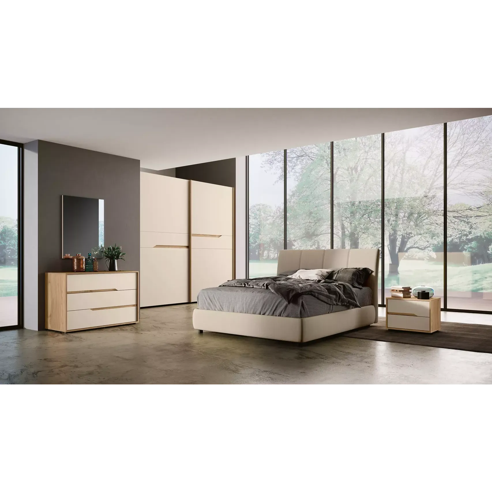 Camera da letto matrimoniale moderna con armadio scorrevole, finitura Orzo e Noce biondo
