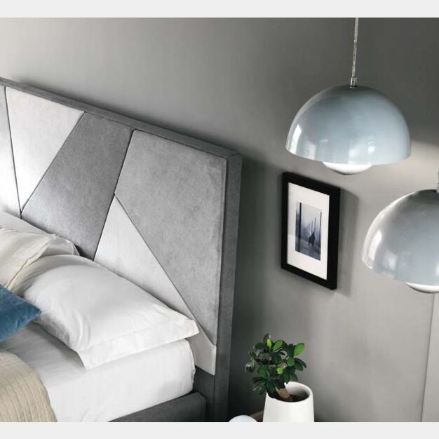 Il letto matrimoniale presenta una lavorata testata che ricca di linee diagonali che creano motivi geometrici, tre sono le finiture che si alternano per creare un effetto moderno e originale, come optional è possibile richiedere la rete a doghe fissa (160x195) o la versione contenitore per riporre cuscini e coperte.