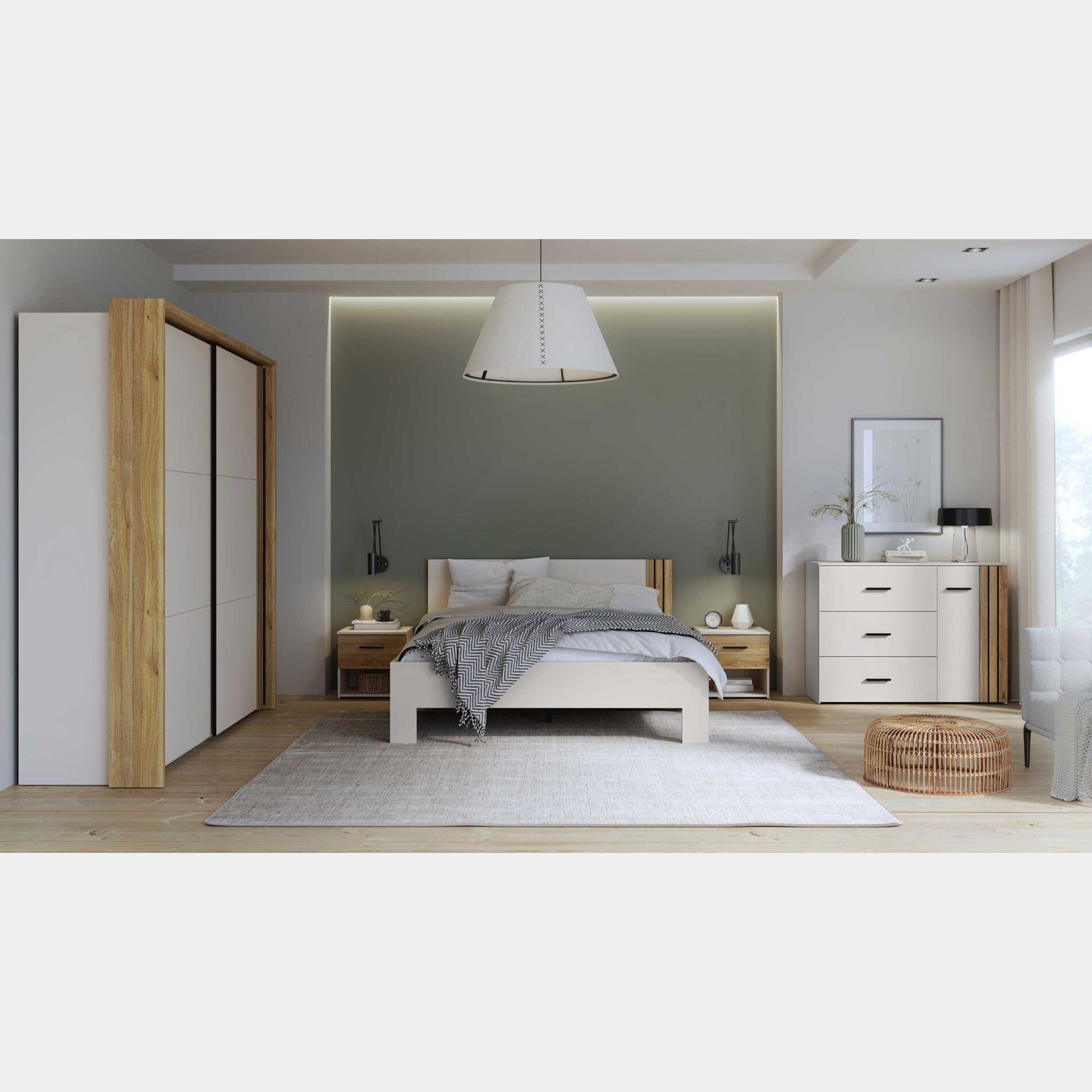 Camera da letto moderna in doppia finitura Rovere e Sabbia dal design seducente alla vista grazie alla combinazione dei due colori a cui si aggiungono sottili linee nere in alcuni punti dei singoli componenti del mobilio. A ciò si unisce l'enorme multifunzionalità della composizione, somma di quella dei singoli pezzi.