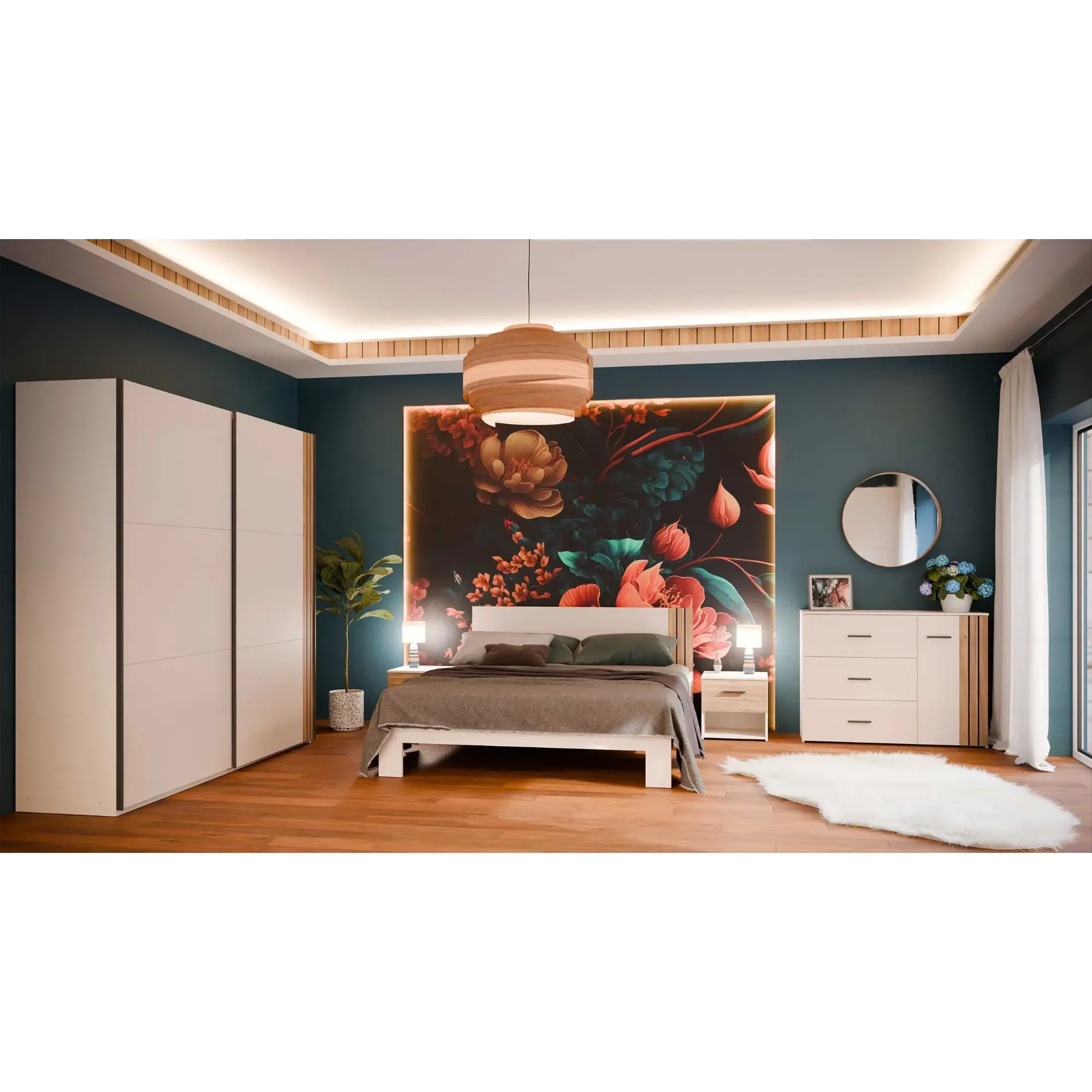 Essa si compone di un armadio (eventualmente provvisto di un ulteriore set di ripiani Grigio tessuto e di un passpartout Rovere), di un comò capiente, di una coppia di comodini e di un largo e confortevole letto matrimoniale. Un insieme di articoli che, se già da soli brillano per bellezza e versatilità, non possono far altro che trasferirle alla camera stessa, facendola risaltare ancor di più.