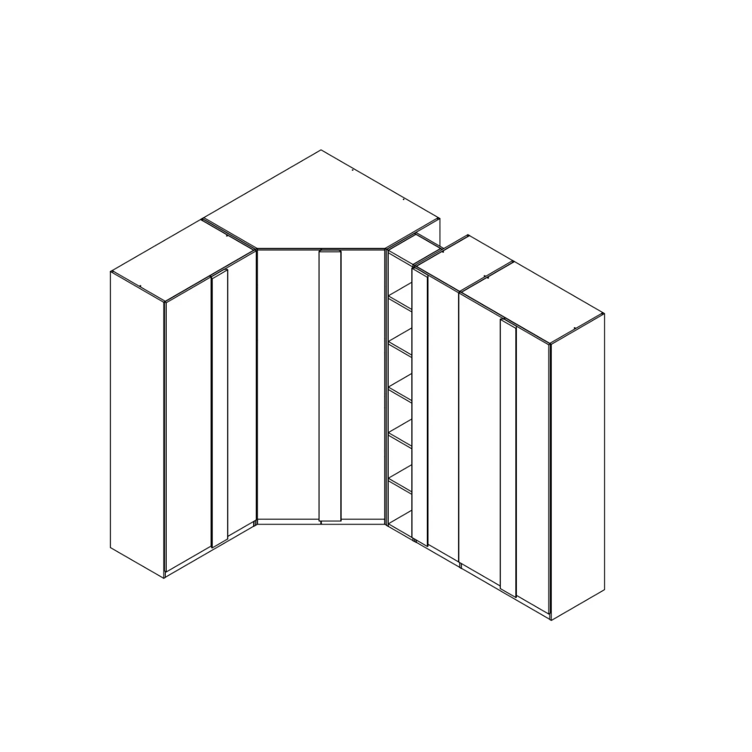 L'armadio angolare è caratterizzato un modulo a due ante battenti, una cabina, una libreria (con profondità minore) ed un terminale a due ante.