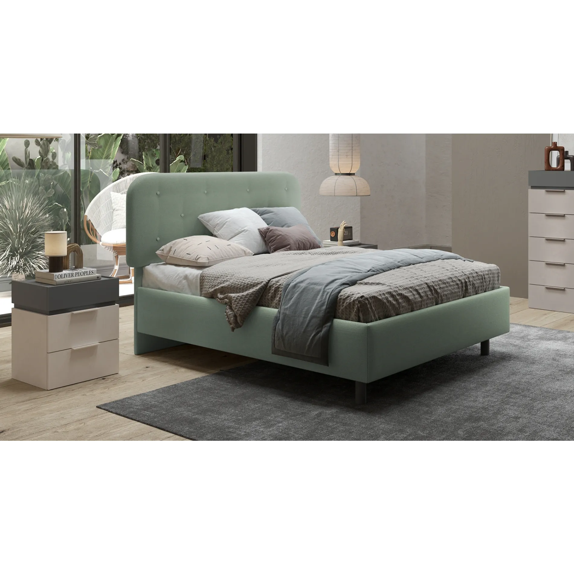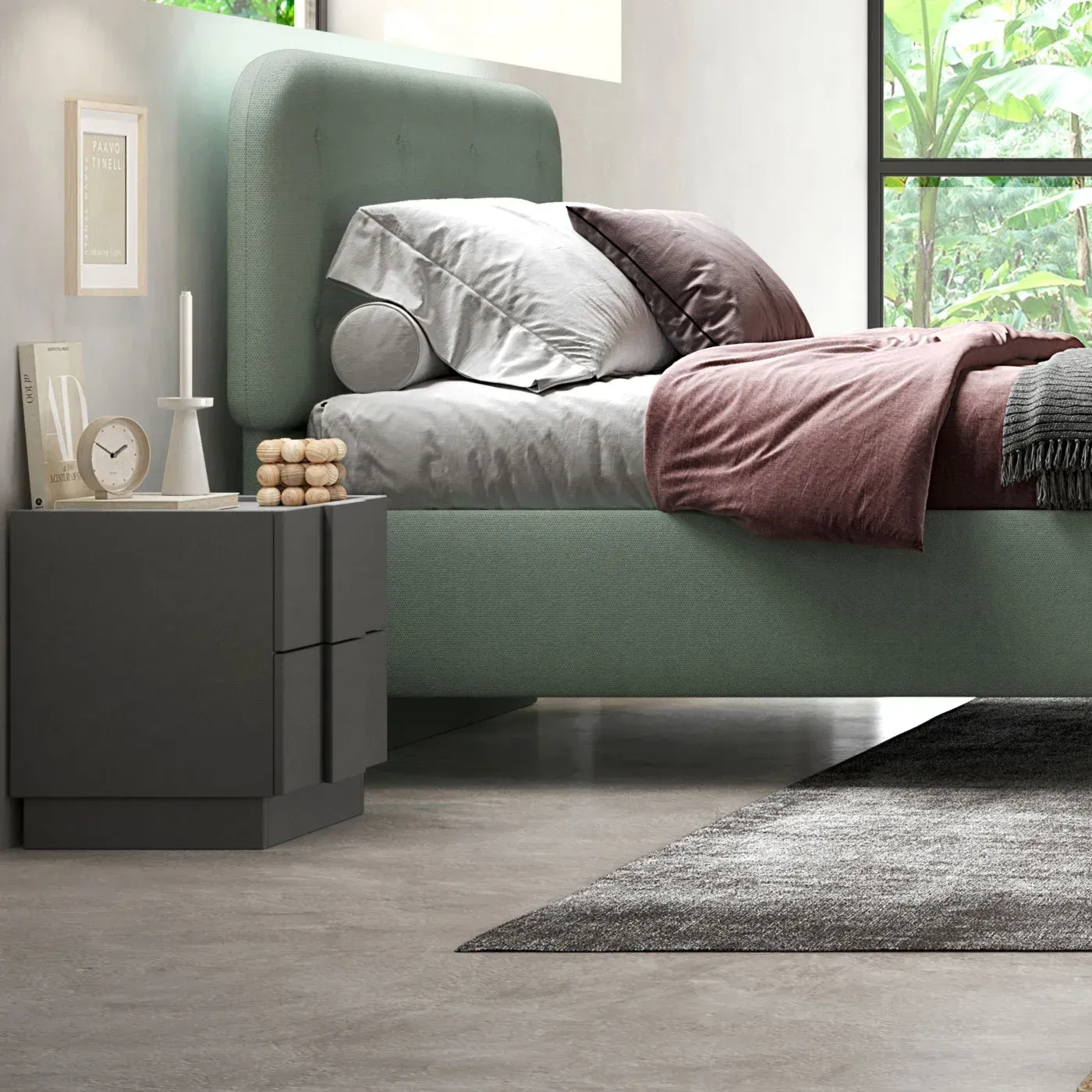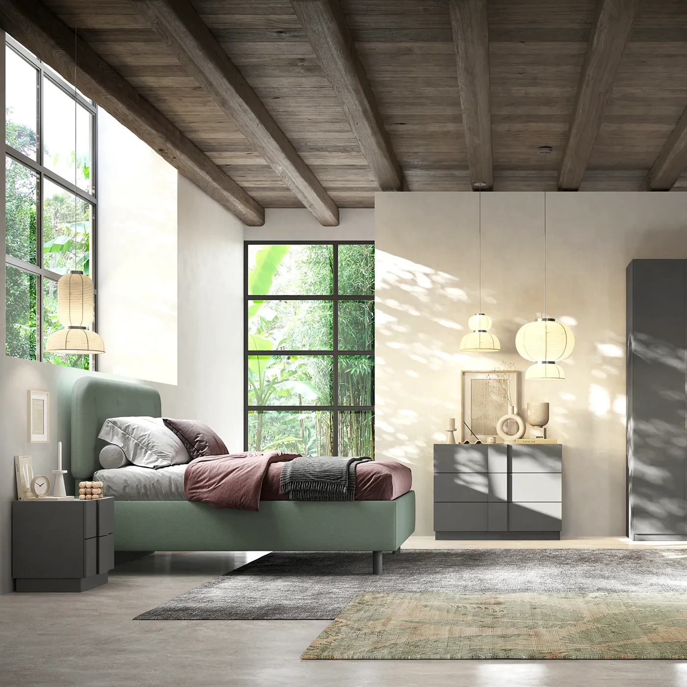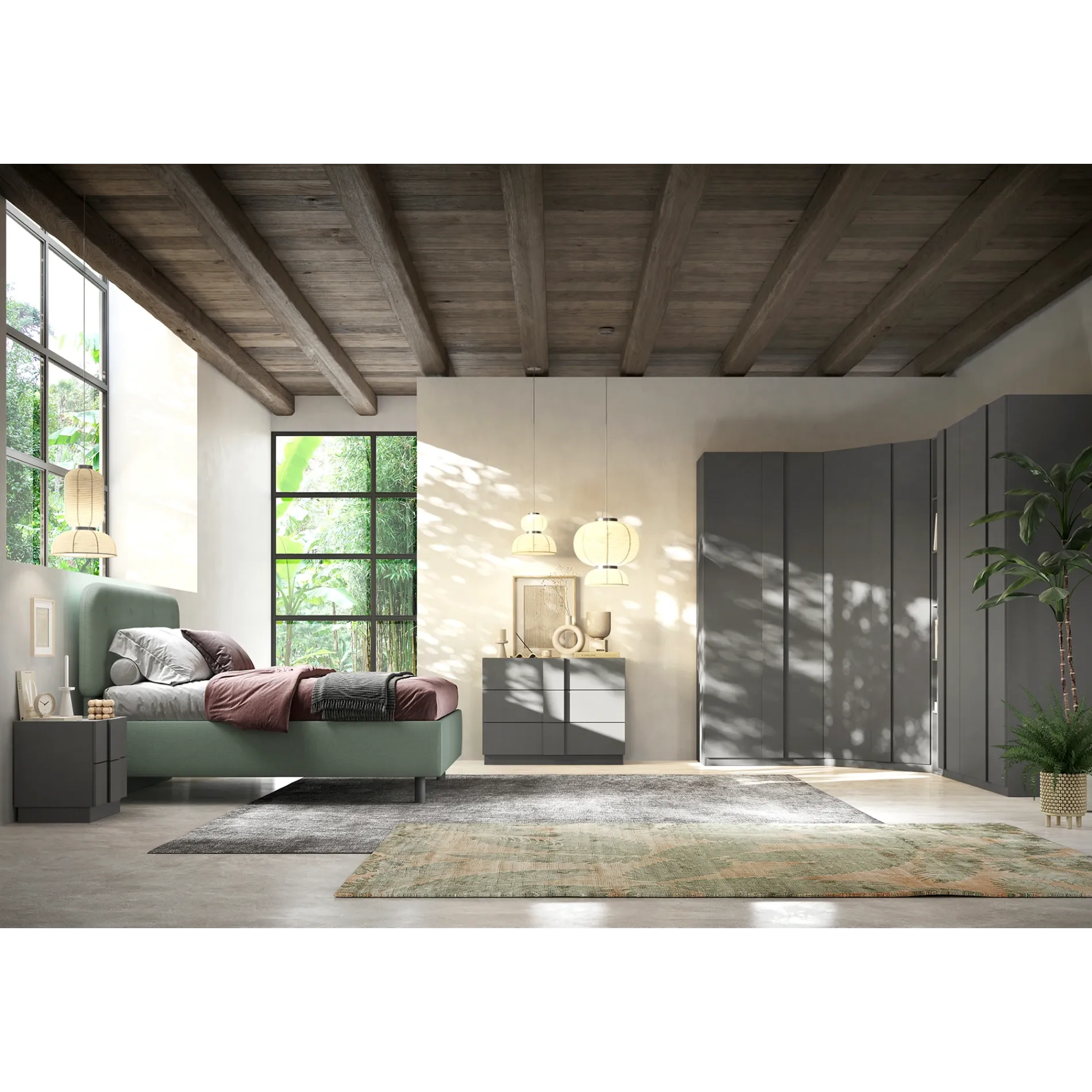 Il letto matrimoniale è proposto in tessuto Verde salvia, tinta delicata che crea un netto contrasto con armadio e comodini, esaltandole la linea moderna.