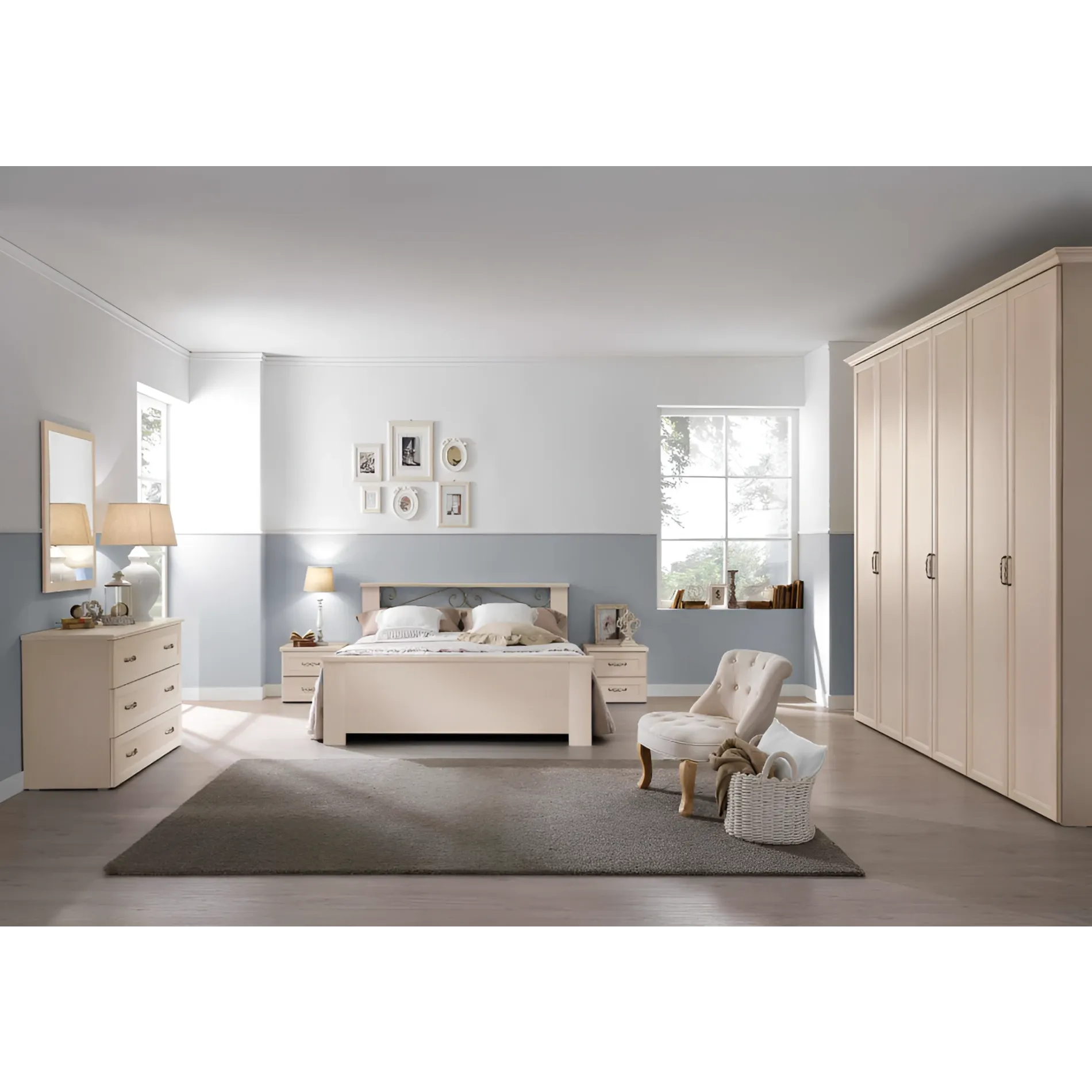 Il letto matrimoniale presenta una testata lavorata con inserto che riprende le maniglie di armadio e comodini e pediera squadrata, in finitura Beige patinato. Supporta rete e materasso (non inclusi) 160x190.