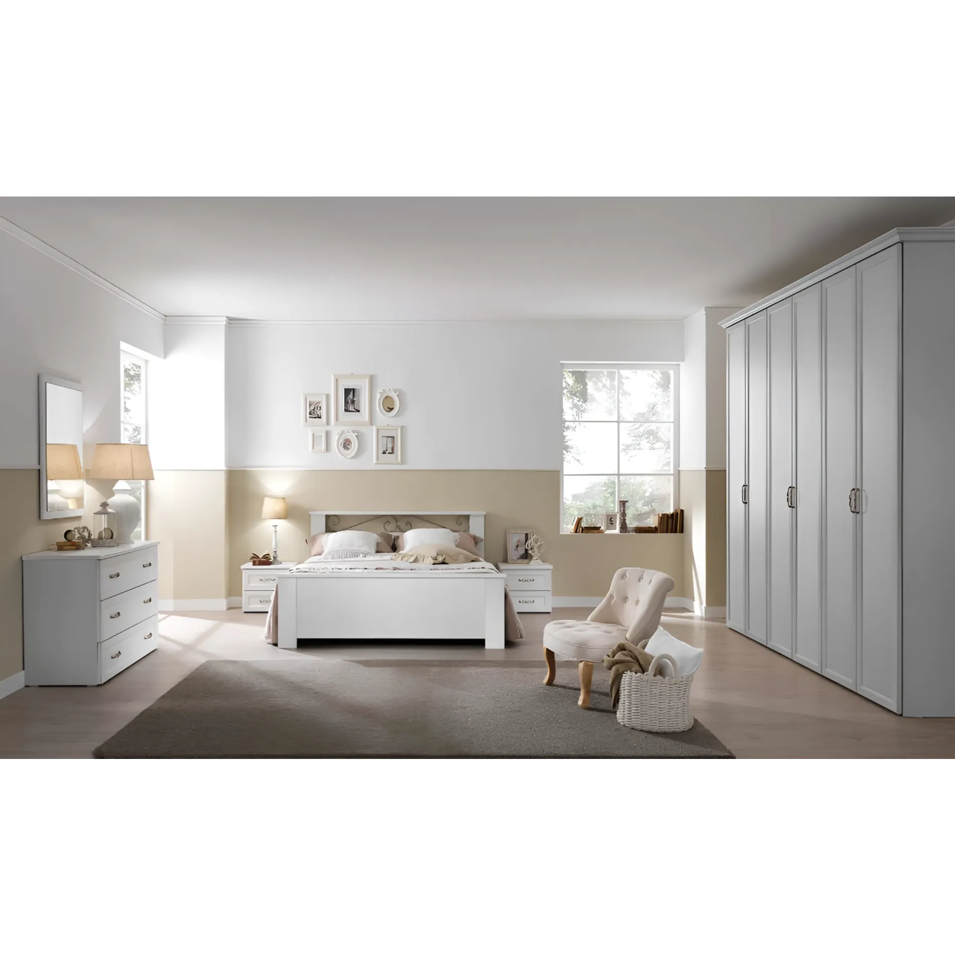 Il letto matrimoniale presenta una testata lavorata e pediera squadrata, in finitura Bianco frassinato. Supporta rete e materasso (non inclusi) 160x190.