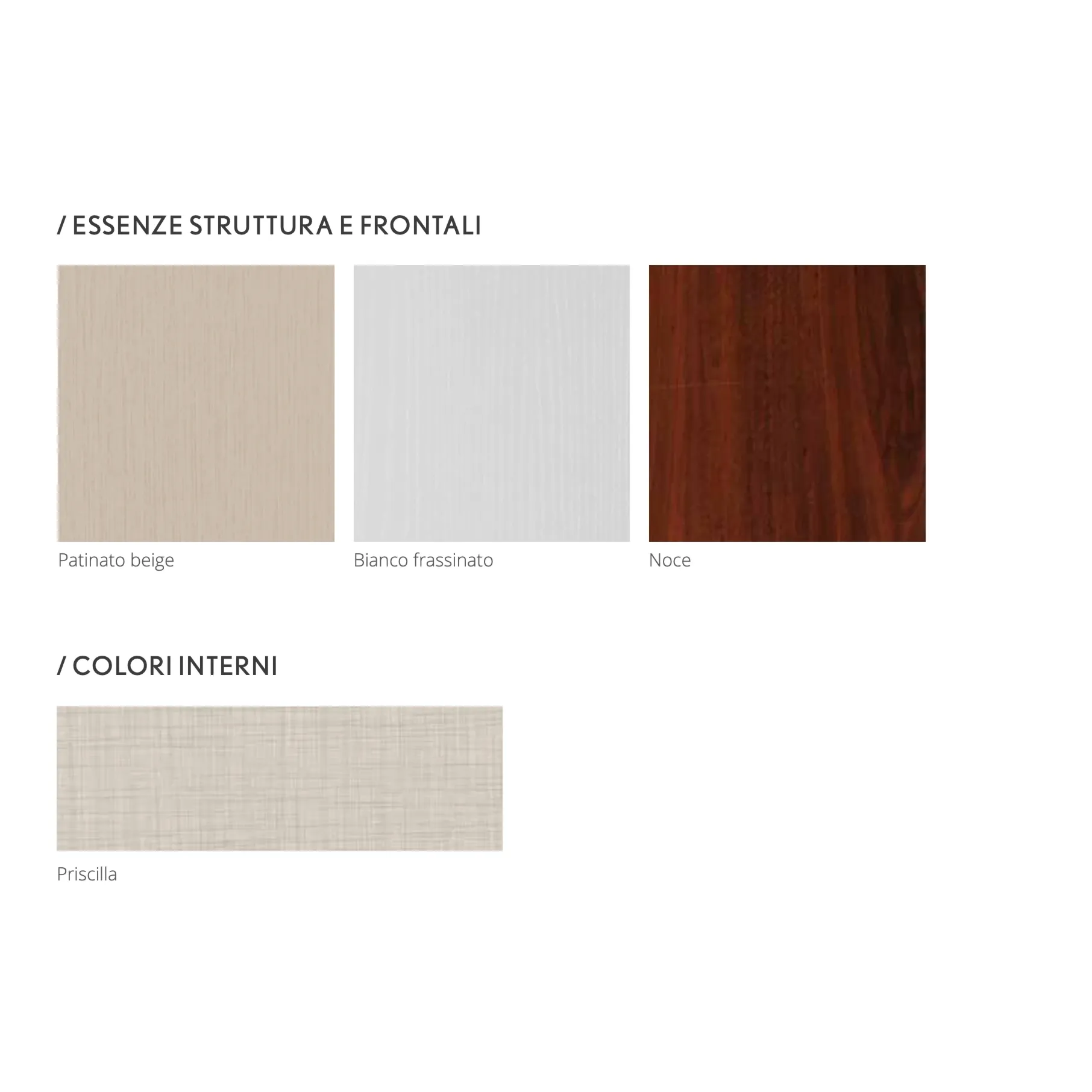 La tinta proposta per la camera classica è Bianco frassinato, calda tonalità che rende l'ambiente accogliente e ricercato; a disposizione vi sono altre tinte per poterla personalizzare.