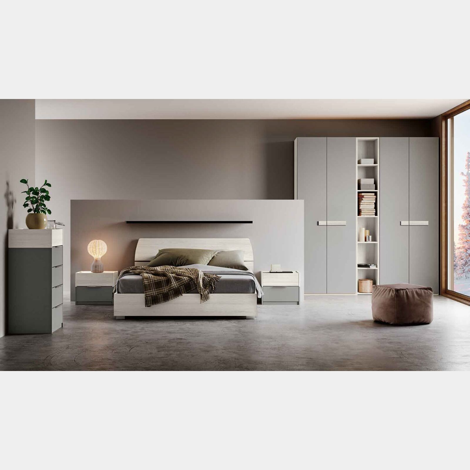 La camera è composta da un letto matrimoniale con testata stondata a cui è possibile aggiungere la rete a doghe fissa o quella contenitore, una coppia di comodini a due cassetti con guide ammortizzate e l'armadio.