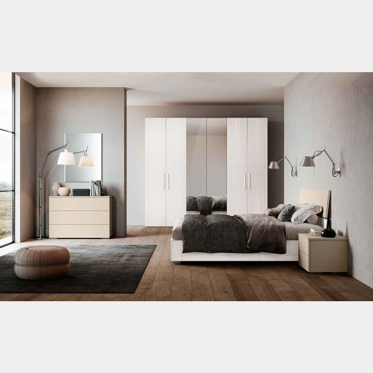 La camera da letto matrimoniale è composta da un armadio a 6 ante battenti, una coppia di comodini a due cassetti, un comò a tre cassetti e la specchiera. Le finiture proposte si accostano per creare armonia e calore all'ambiente.
