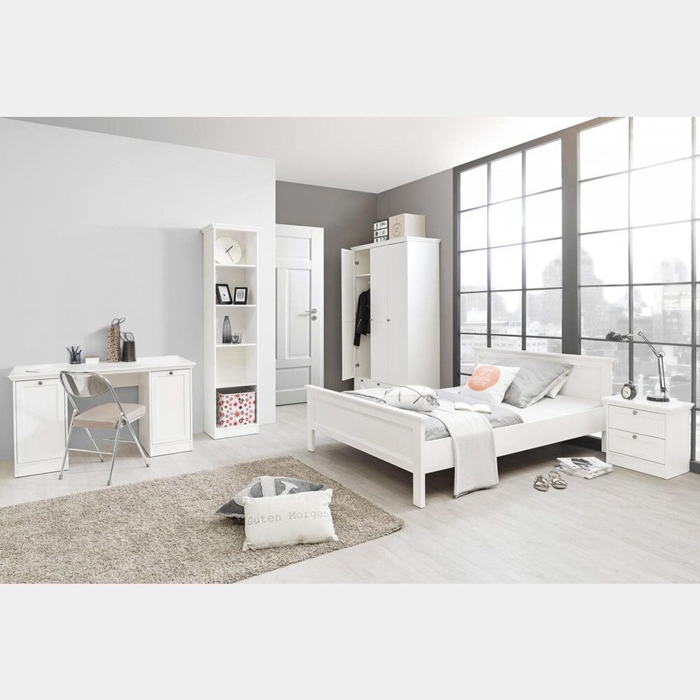 Camera matrimoniale completa di Letto alla francese, Comodino, Armadio 3 ante e 3 cassetti, Libreria e scrivania.Letto matrimoniale, colore bianco, testiera e pediera in melaminicoLasciati stupire da una struttura pulita della testiera e pediera rendendo la tua camera protagonista. La bellezza di questo letto matrimoniale sta tutta nella sua semplicità.