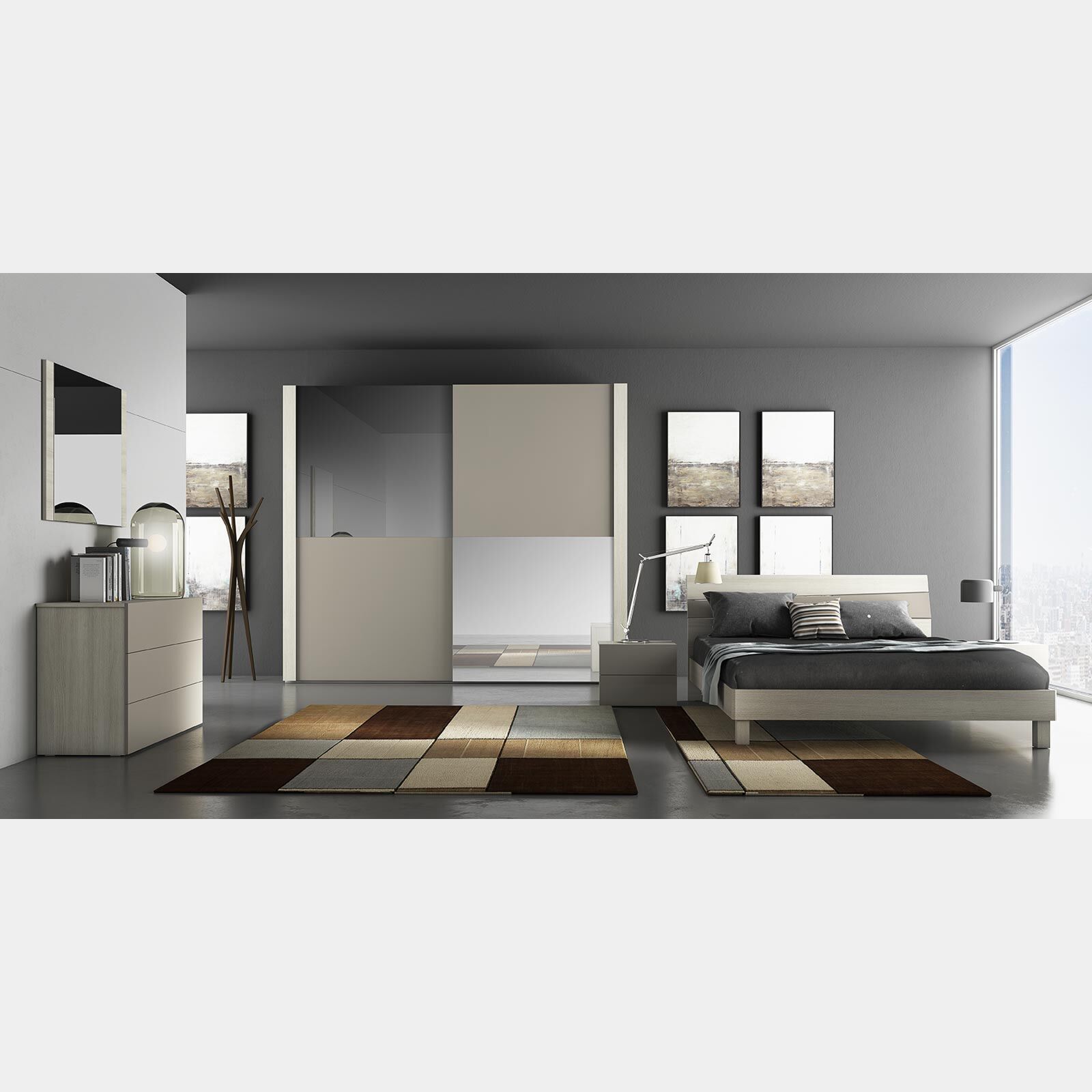 Camera matrimoniale completa Falco con armadio ad ante scorrevoli in finitura Olmo e Tortora